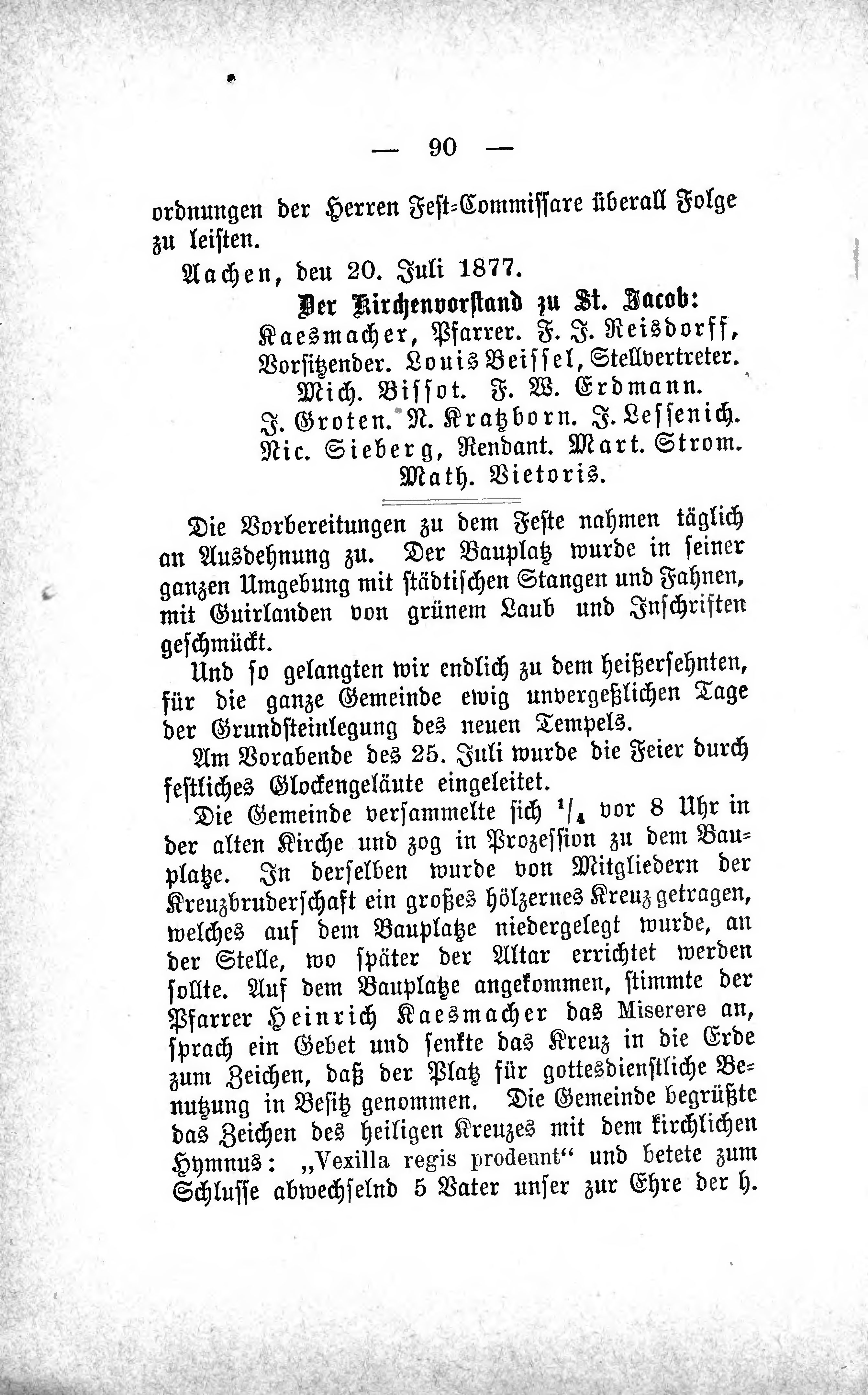 - Kaesmacher, Pfarrer. F. J. Reisdorff, Vorsitzender. Louis Beissel, Stellvertreter. Mich. Bissot. F. W. Erdmann. J. Groten. N. Kratzborn. J. Lessenich. Nic. Sieberg, Rendant. Mart. Strom. Math. Vietoris.