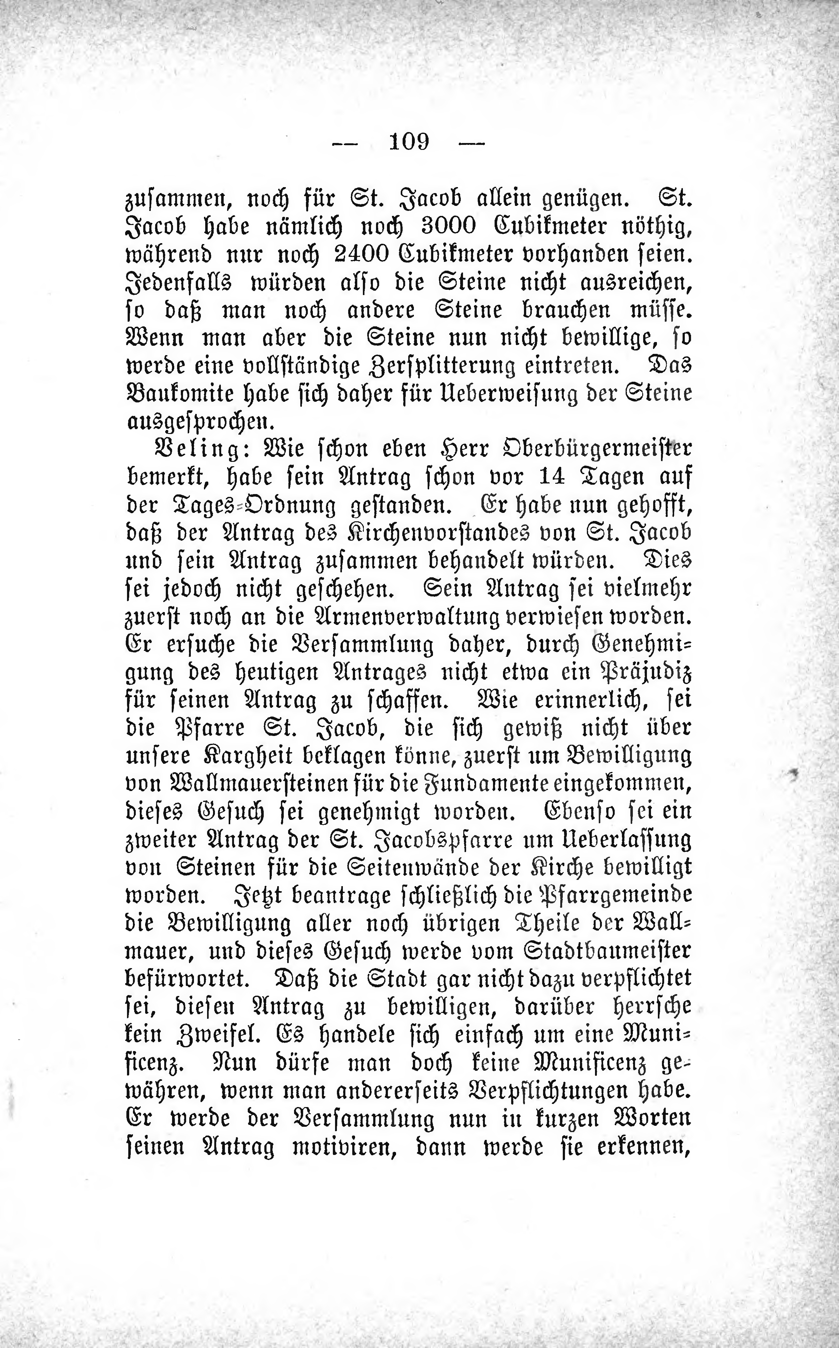 Veling: Wie schon eben Herr Oberbürgermeister bemerkt, habe sein Antrag schon vor 14 Tagen auf der Tagesordnung gestanden. Er habe nun gehofft, daß der Antrag des Kirchenvorstandes von St. Jacob und sein Antrag zusammen behandelt würden. Dies sei jedoch nicht geschehen. Sein Antrag sei vielmehr zuerst noch an die Armenverwaltung verwiesen worden. Er ersuche die Versammlung daher, durch Genehmigung des heutigen Antrages nicht etwa ein Präjudiz für seinen Antrag zu schaffen. Wie erinnerlich, sei die Pfarre St. Jacob, die sich gewiß nicht über unsere Kargheit beklagen könne, zuerst um Bewilligung von Wallmauersteinen für die Fundamente eingekommen, dieses Gesuch sei genehmigt worden. Ebenso sei ein zweiter Antrag der St. Jacobspfarre um Ueberlassung von Steinen für die Seitenwände der Kirche bewilligt worden. Jetzt beantrage schließlich die Pfarrgemeinde die Bewilligung aller noch übrigen Theile der Wallmauer, und dieses Gesuch werde vom Stadtbaumeister befürwortet. Das die Stadt gar nicht dazu verpflichtet sei, diesen Antrag zu bewilligen, darüber herrsche kein Zweifel. Es handele sich einfach um eine Munificenz. Nun dürfe man doch keine Munificenz gewähren, wenn man andererseits Verpfliichtungen habe. Er werde der Versammlung nun in kurzen Worten seinen Antrag motiviren, dann werde sie erkennen,
