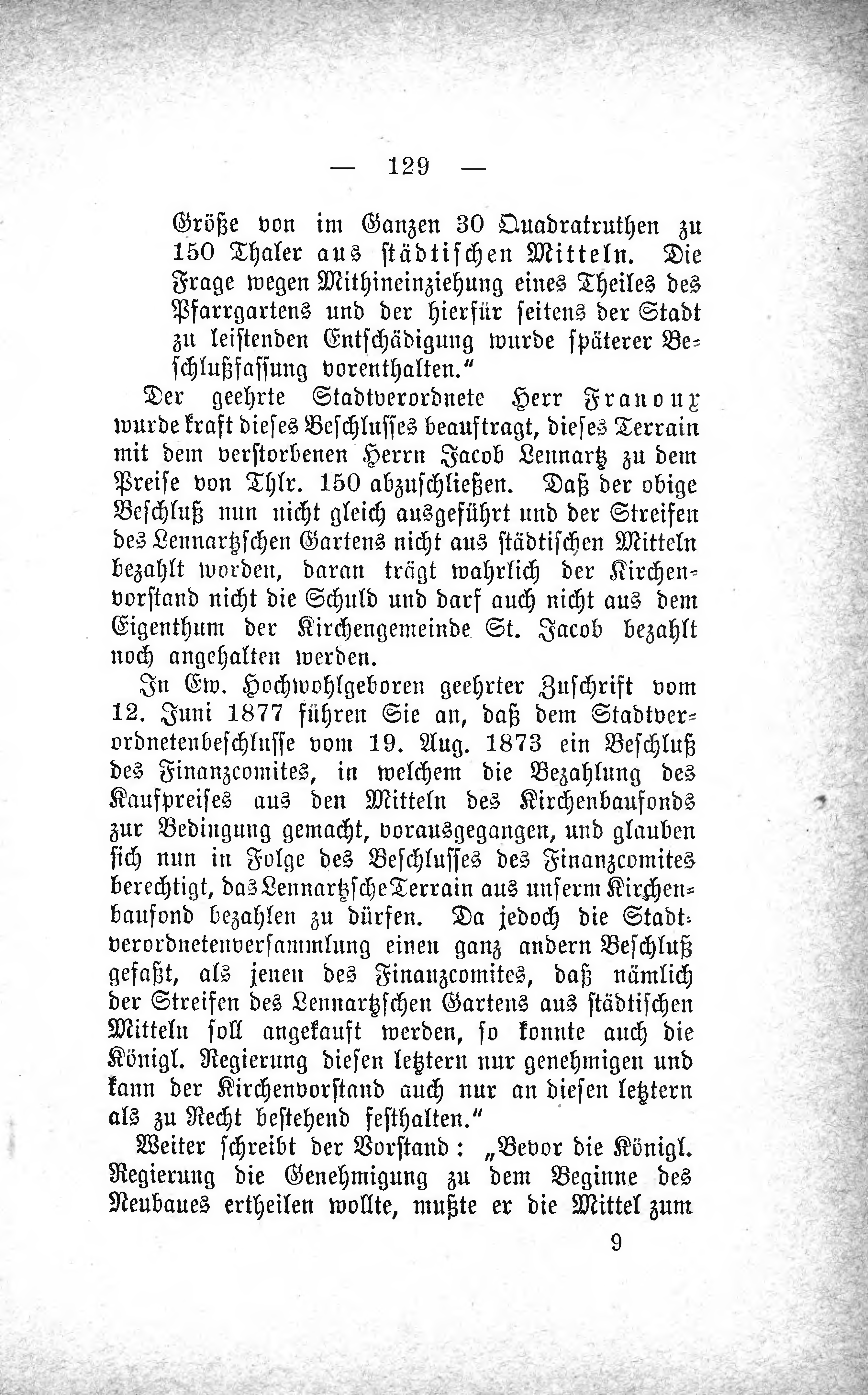 - Größe von im Ganzen 30 Quadratruthen zu 150 Thaler aus städtischen Mitteln. Die Frage wegen Mithineinziehung eines Theiles des Pfarrgartens und der hierfür seitens der Stadt zu leistenden Entschädigung wurde späterer Beschlußfassung vorenthalten.“