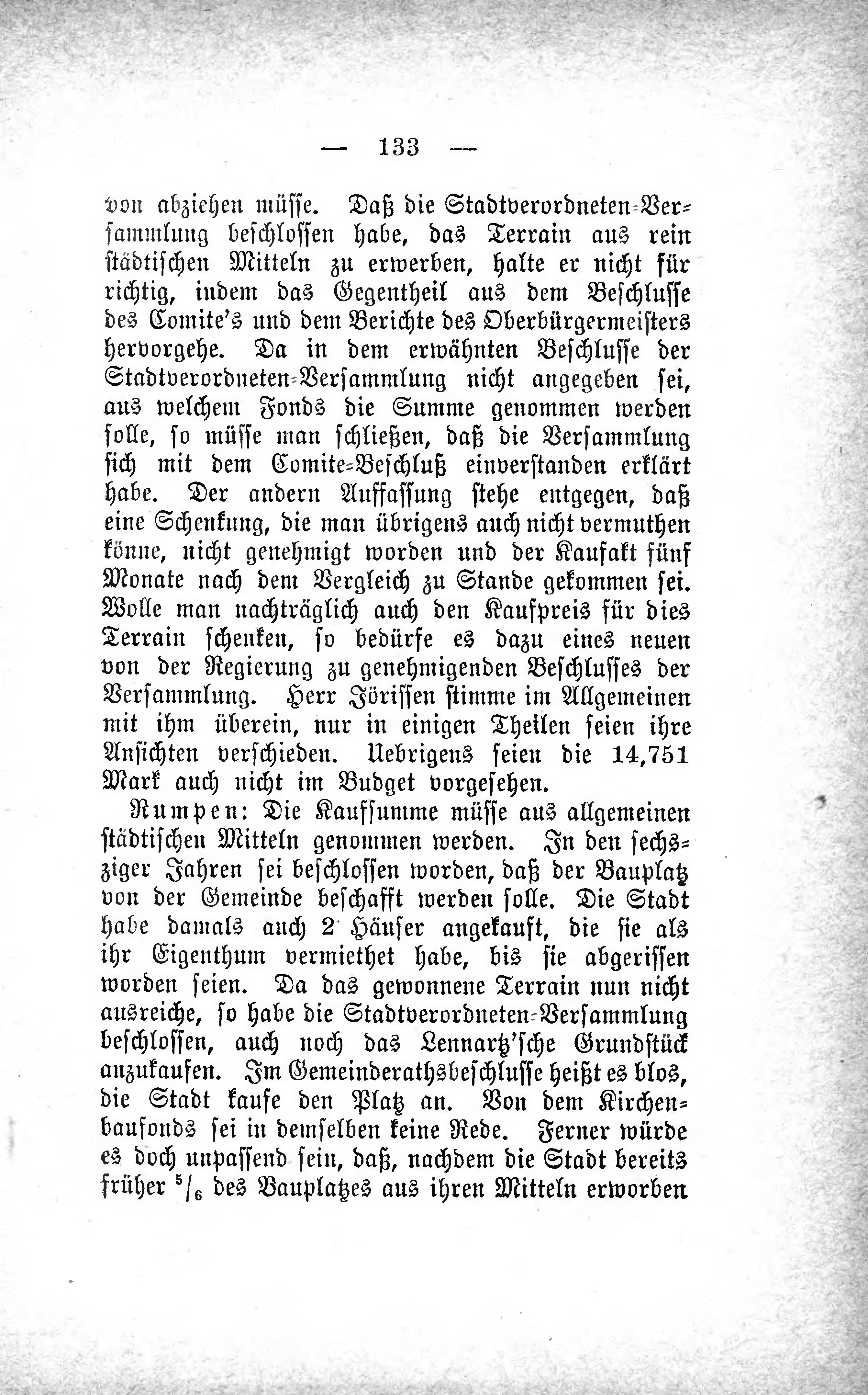 abziehen müsse. Daß die Stadtverordneten-Versammlung beschlossen habe, das Terrain aus rein städtischen Mitteln zu erwerben, halte er nicht für richtig, indem das Gegentheil aus dem Beschlusse des Comite's und dem Berichte des Oberbürgermeisters hervorgehe. Da in dem erwähnten Beschlusse der Stadtverordneten-Versammlung nicht angegeben sei, aus welchem Fonds die Summe genommen werden solle, so müsse man schließen, daß die Versammlung sich mit dem Comite-Beschluß einverstanden erklärt habe. Der andern Auffassung stehe entgegen, daß eine Schenkung, die man übrigens auch nicht vermuthen könne, nicht genehmigt worden und der Kaufakt fünf Monate nach dem Vergleich zu Stande gekommen sei. Wolle man nachträglich auch den Kaufpreis für dies Terrain schenken, so bedürfe es dazu eines neuen von der Regierung zu genehmigenden Beschlusses der Versammlung. Herr Jörissen stimme im Allgemeinen mit ihm überein, nur in einigen Theilen seien ihre Ansichten verschieden. Uebrigens seien die 14,751 Mark auch nicht im Budget vorgesehen.