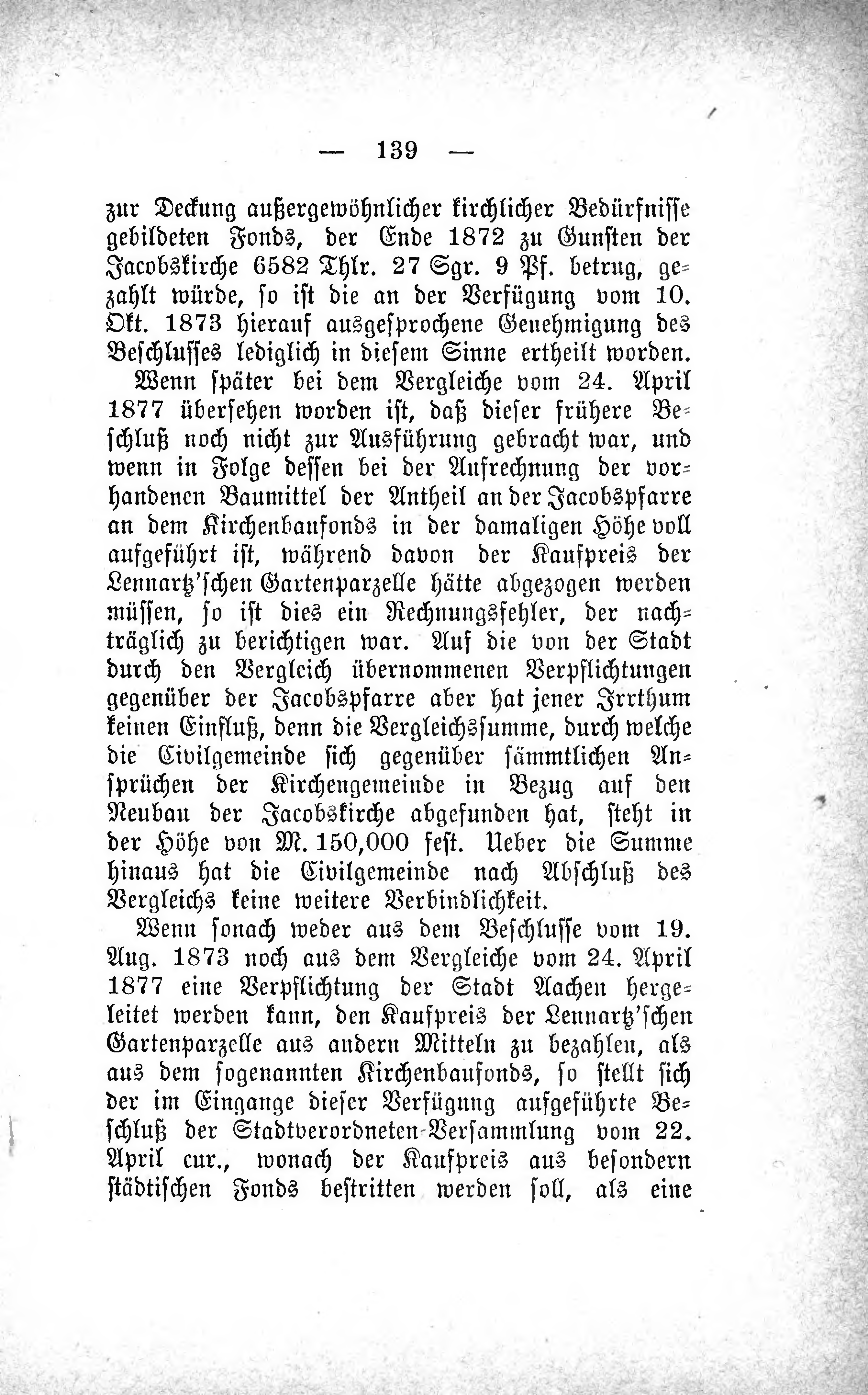 Wenn sonach weder aus dem Beschlusse vom 19. Aug. 1873 noch aus dem Vergleiche vom 24. April 1877 eine Verpflichtung der Stadt Aachen hergeleitet werden kann, den Kaufpreis der Lennartz'schen Gartenparzelle aus andern Mitteln zu bezahlen, als aus dem sogenannten Kirchenbaufonds, so stellt sich der im Eingange dieser Verfügung aufgeführte Beschluß der Stadtverordneten-Versammlung vom 22. April cur., wonach der Kaufpreis aus besondern städtischen Fonds bestritten werden soll, als eine