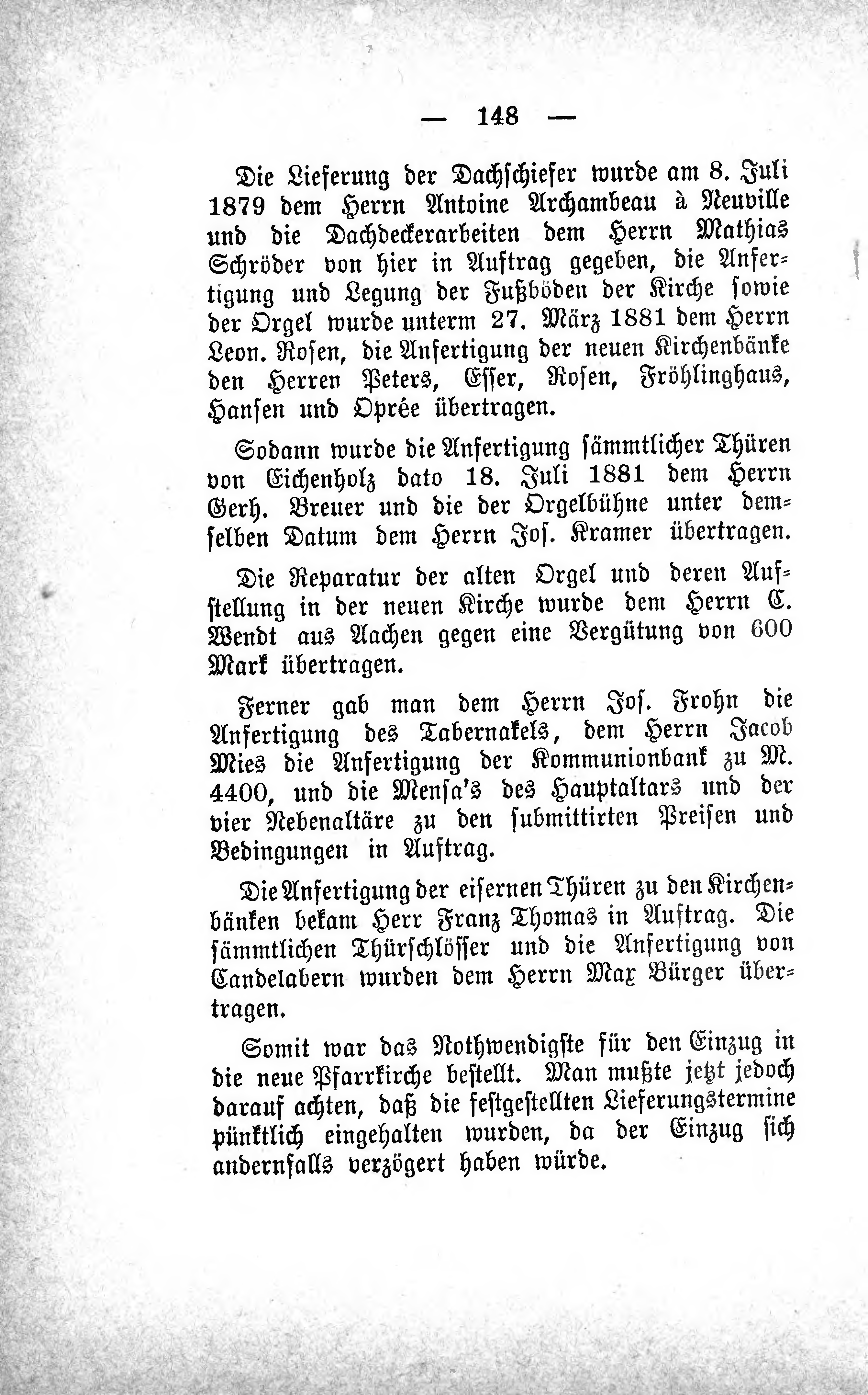 Die Lieferung der Dachschiefer wurde am 8. Juli 1879 dem Herrn Antoine Archambeau à Neuville und die Dachdeckerarbeiten dem Herrn Mathias Schröder von hier in Auftrag gegeben, die Anfertigung und Legung der Fußböden der Kirche sowie der Orgel wurde unterm 27. März 1881 dem Herrn Leon. Rosen, die Anfertigung der neuen Kirchenbänke den Herren Peters, Esser, Rosen, Fröhlinghaus, Hansen und Oprée übertragen.