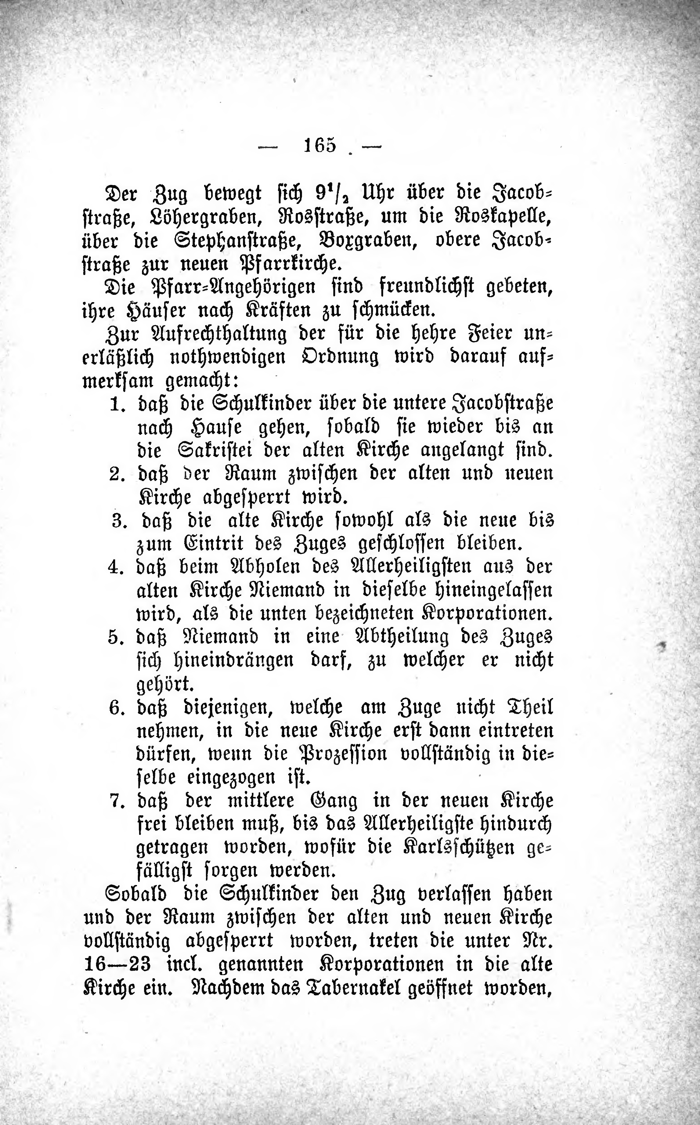Der Zug bewegt sich 91/2 Uhr über die Jacobstraße, Löhergraben, Rosstraße, um die Roskapelle, über die Stephanstraße, Boxgraben, obere Jacobstraße zur neuen Pfarrkirche.