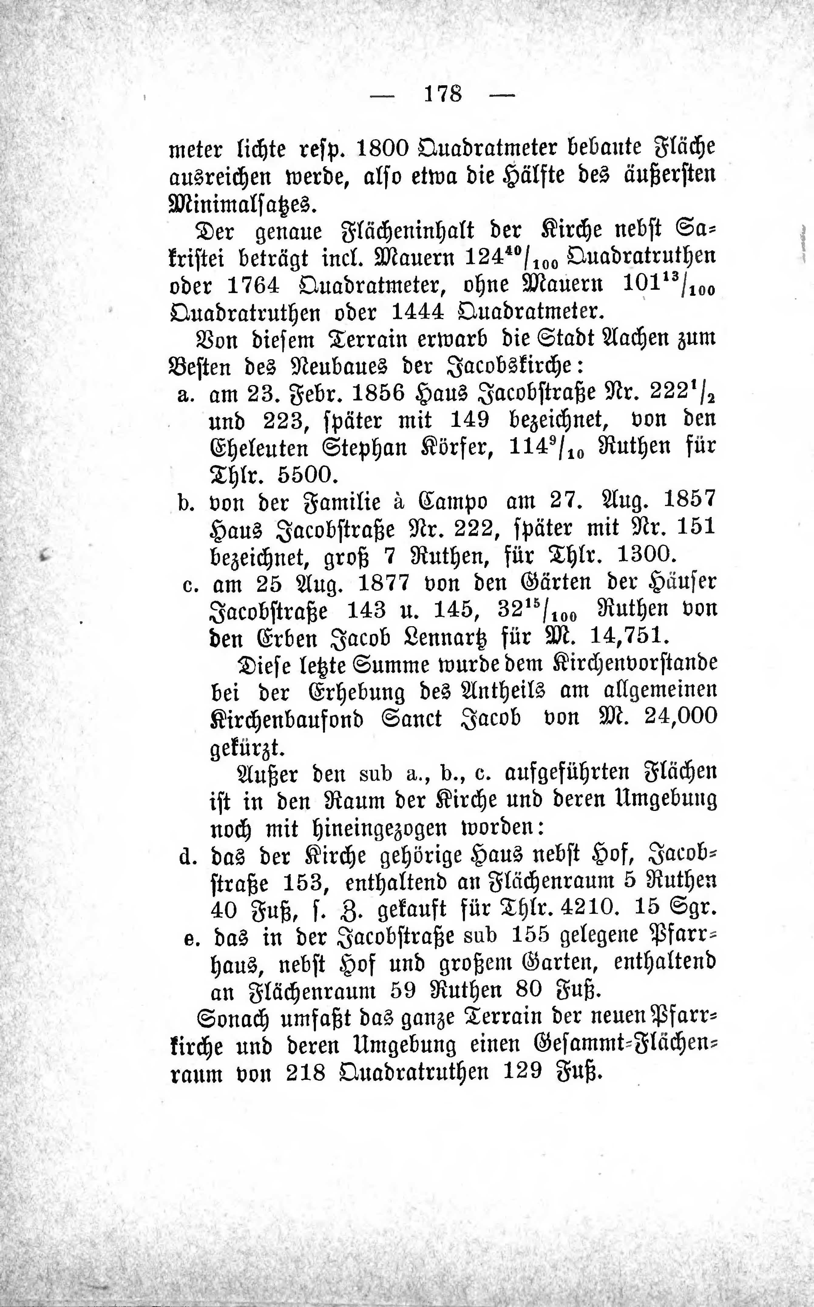 | c. | am 25 Aug. 1877 von den Gärten der Häuser Jacobstraße 143 u. 145, 3215/100 Ruthen von den Erben Jacob Lennartz für M. 14,751. |