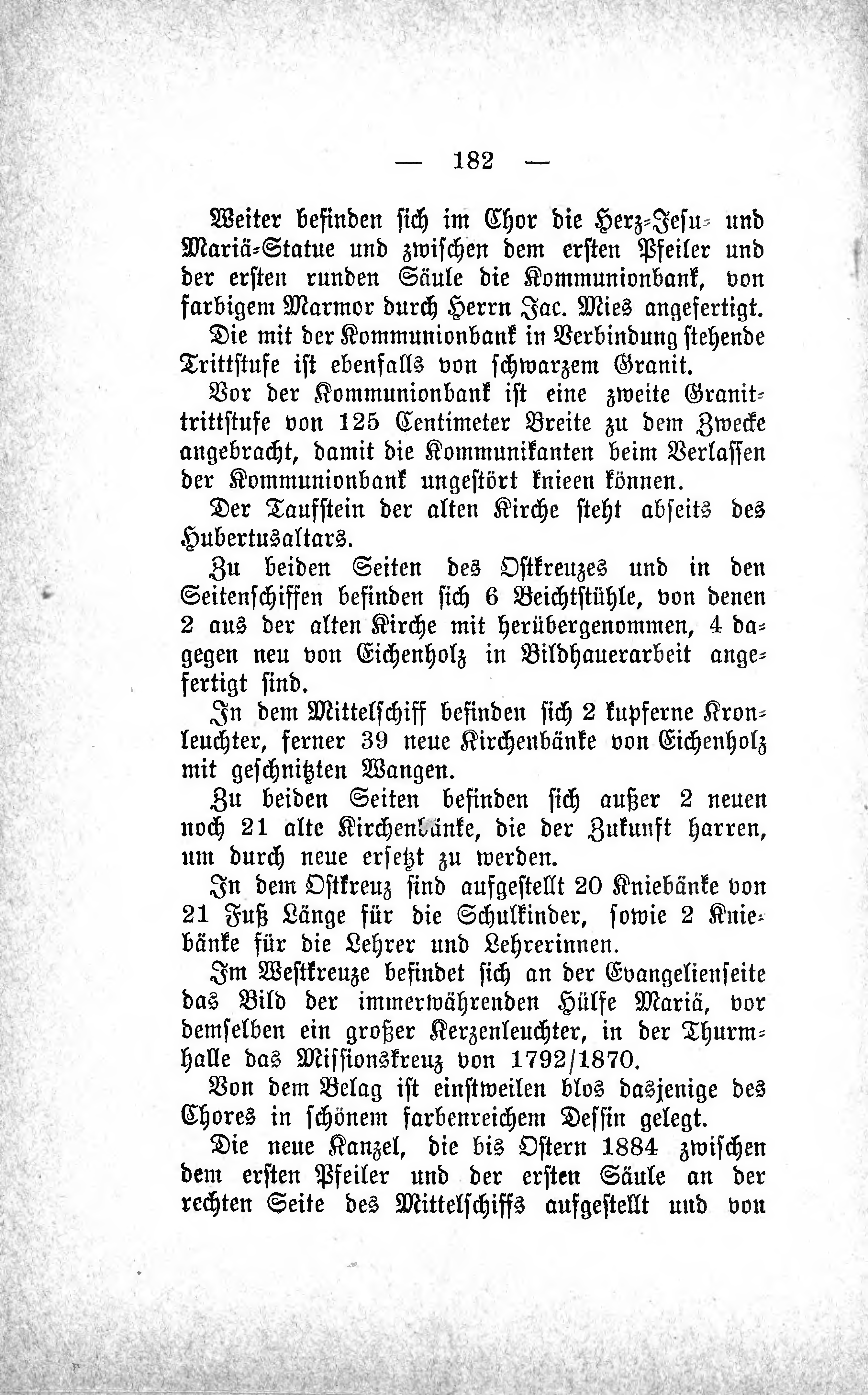 Weiter befinden sich im Chor die Herz-Jesu- und Mariä-Statue und zwischen dem ersten Pfeiler und der ersten runden Säule die Kommunionbank, von farbigem Marmor durch Herrn Jac. Mies angefertigt.