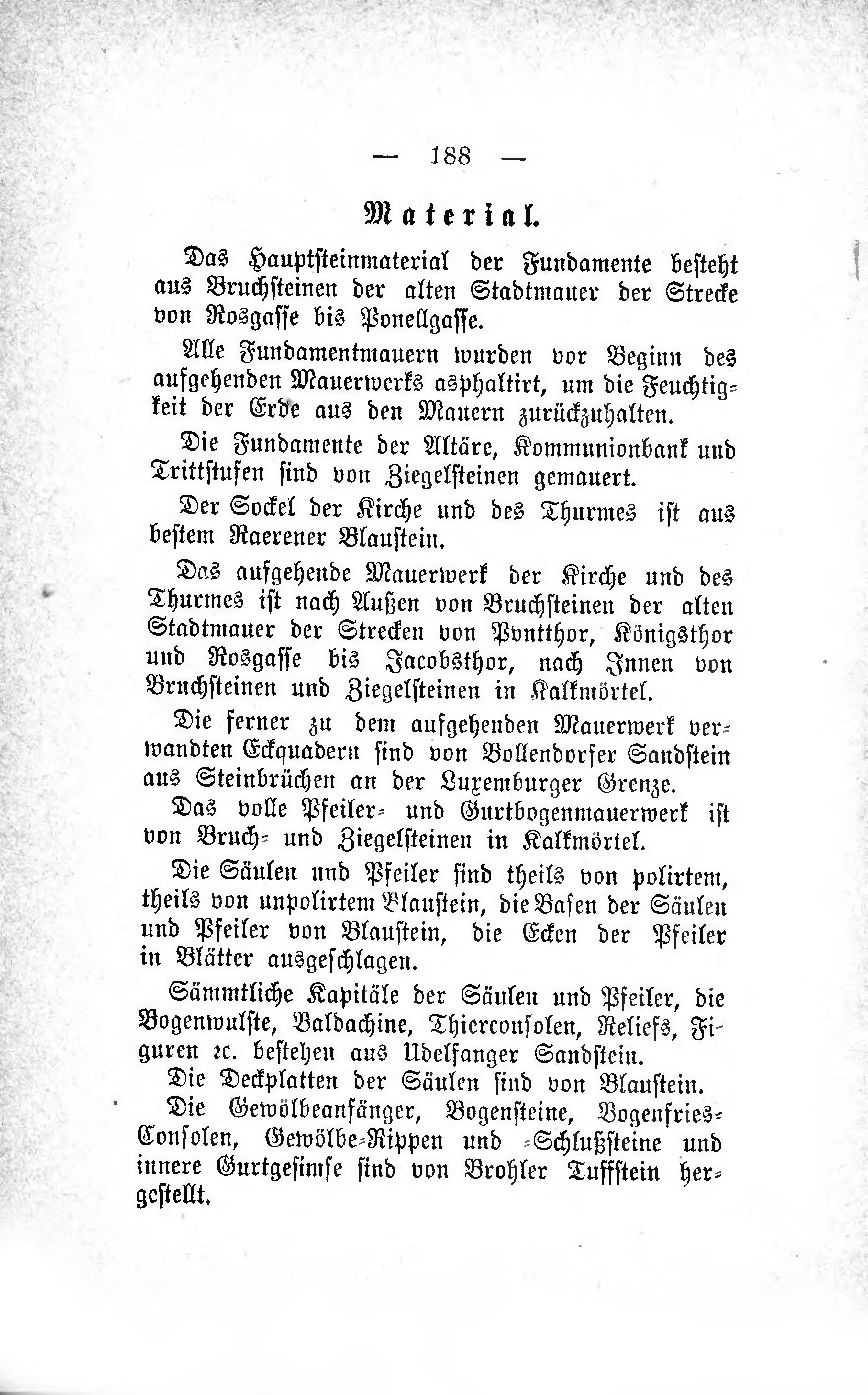 Sämmtliche Kapitäle der Säulen und Pfeiler, die Bogenwulste, Baldachine, Thierconsolen, Reliefs, Figuren ec. bestehen aus Udelfanger Sandstein.