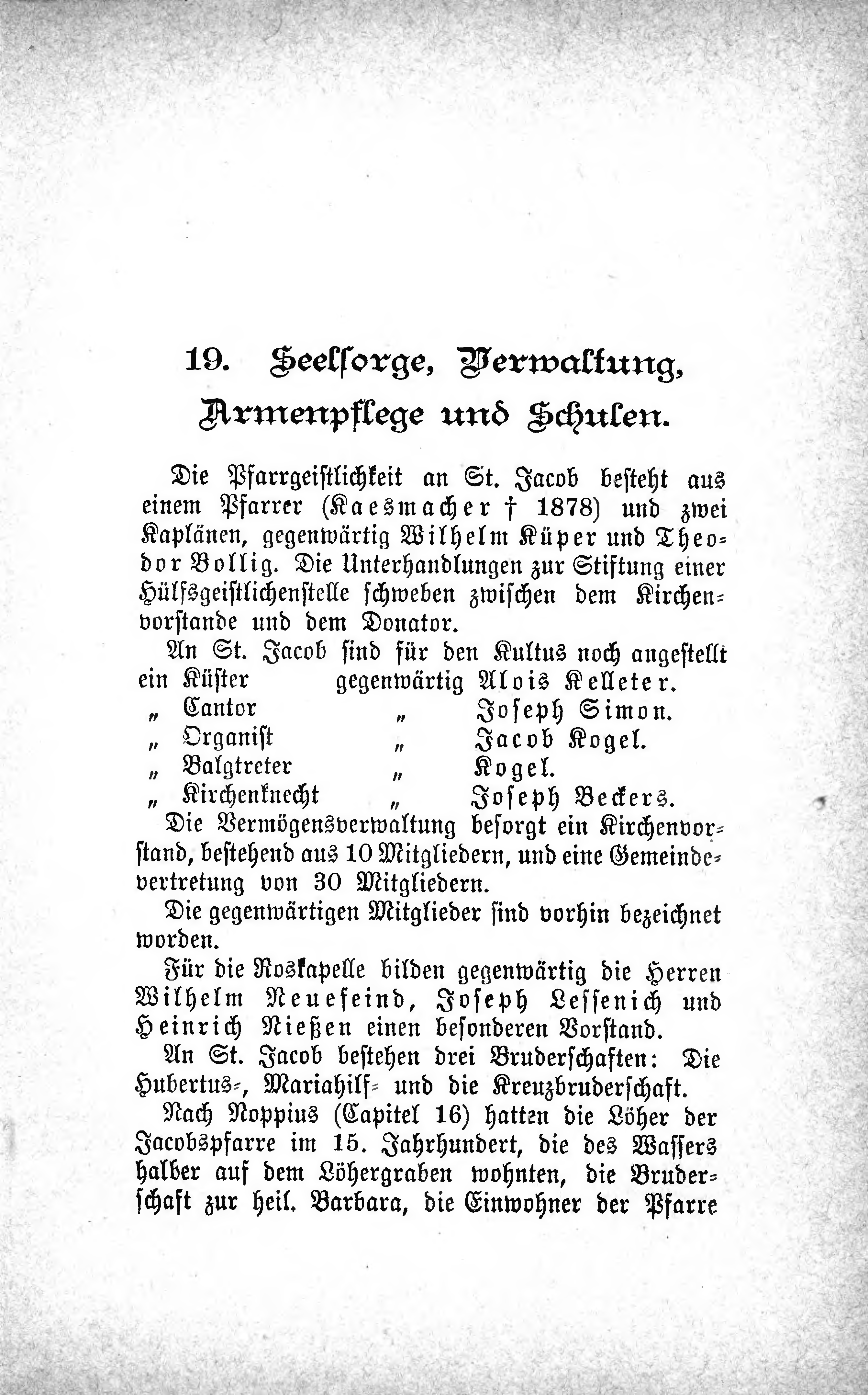 Die Pfarrgeistlichkeit an St. Jacob besteht aus einem Pfarrer (Kaesmacher † 1878) und zwei Kaplänen, gegenwärtig Wilhelm Küper und Theodor Bollig. Die Unterhandlungen zur Stiftung einer Hülfsgeistlichenstelle schweben zwischen dem Kirchenvorstande und dem Donator.