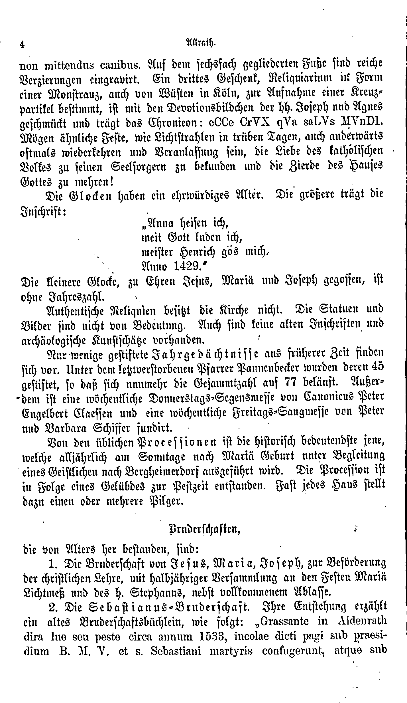 2. Die Sebastianus-Bruderschaft. Ihre Entstehung erzählt ein altes Bruderschaftsbüchlein, wie folgt: "Grassane in Aldenrath dira lue scu peste circa annum 1533, incolae dicti pagi sub praesidium B. M. V. et s. Sebastiani martyris confugerunt, atque sub