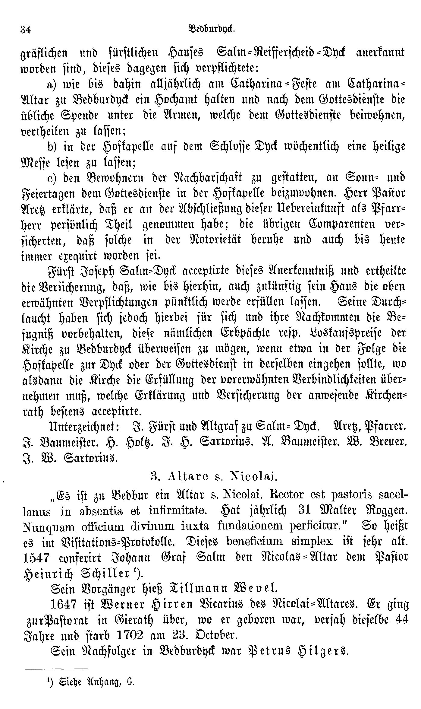 Unterzeichnet: J. Fürst und Altgraf zu Salm-Dyck. Aretz, Pfarrer. J. Baumeister. H. Holtz. J.H.Sartorius. A, Baumeister. W. Breuer. J. W. Sartorius.