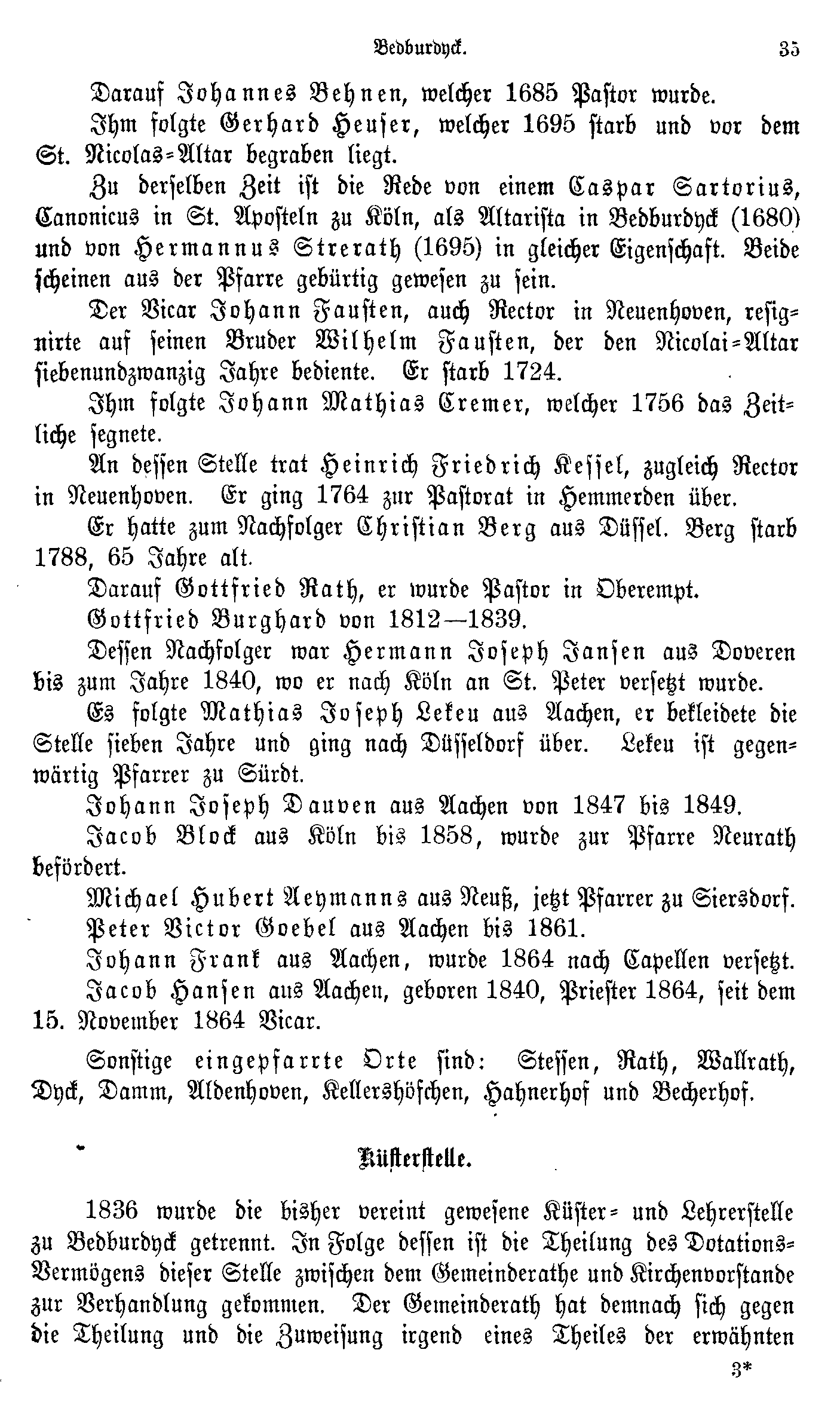 Zu derselben Zeit ist die Rede von einem Caspar Sartorius, Canonicus in St. Aposteln zu Köln, als Altarist in Bedburdyck (1680) und von Hermannus Strerath (1695) in gleicher Eigenschaft. Beide scheinen aus der Pfarre gebürtig gewesen zu sein.