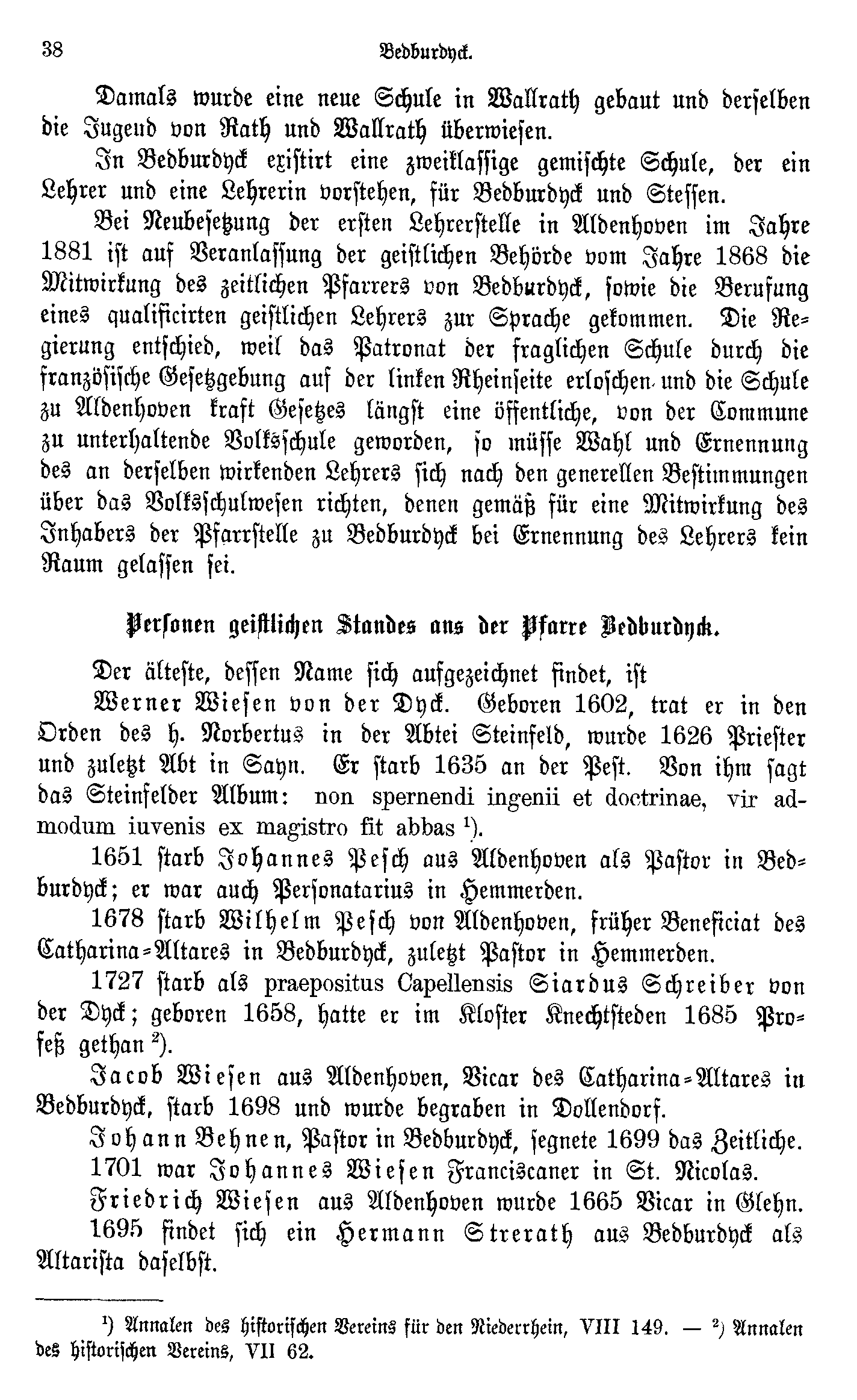 Der älteste, dessen name sich aufgezeichnet findet, ist Werner Wiesen von der Dyck. Geboren 1602, trat er in den Orden des h. Norbertus in der Abtei Steinfeld, wurde 1626 Priester und zuletzt Abt in Sayn. Er starb 1635 an der Pest. Von ihm sagt das Steinfelder Album: non spernendi ingenii et doctrinae, vir admodum iuvenis ex magistro fit abbas.[1]