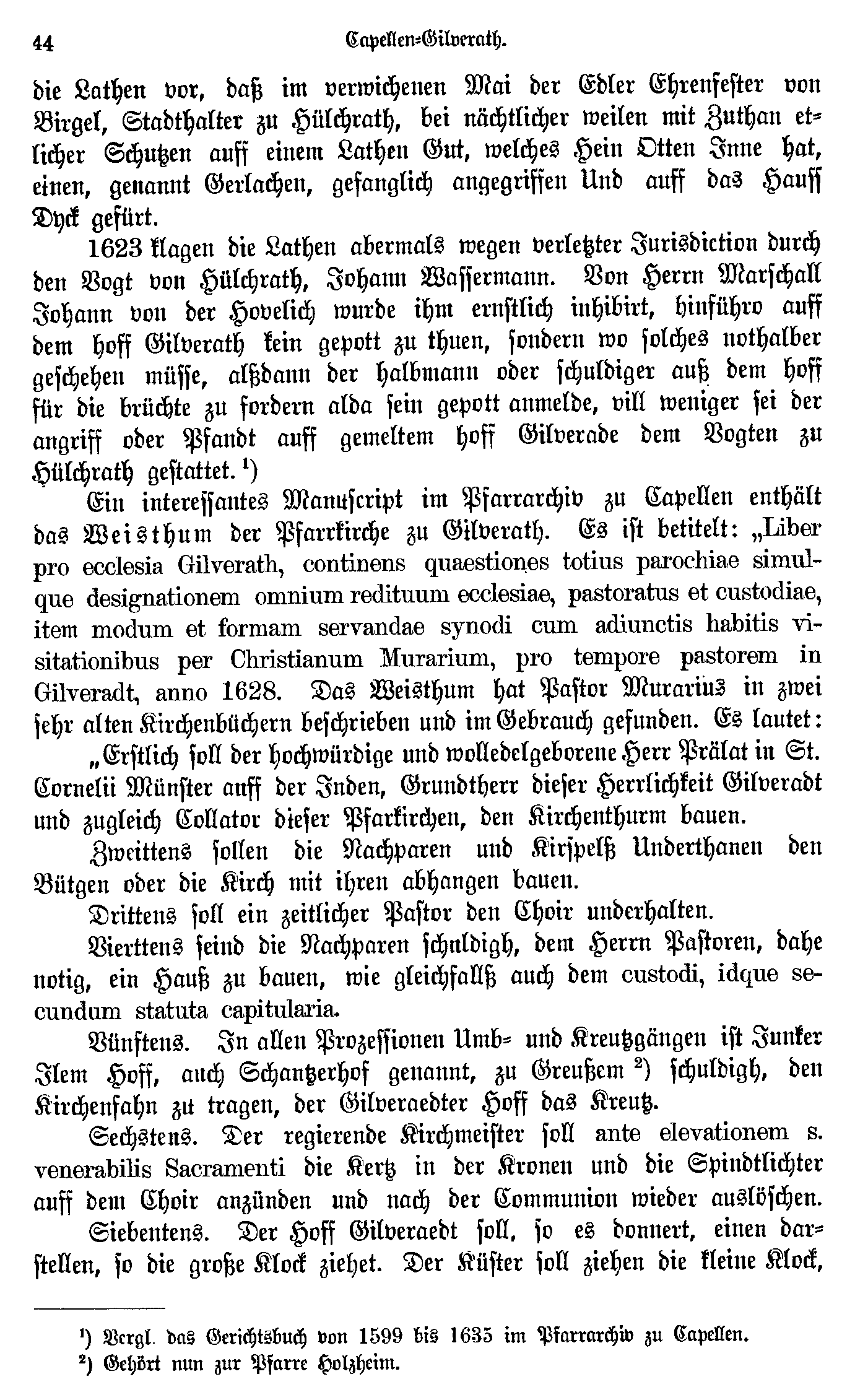 Ein interessantes Manuscript im Pfarrarchiv zu Capellen enthält das Weisthum der Pfarrkirche zu Gilverath. Es ist betitelt: "Liber pro ecclesia Gilverath, continens quaestiones totius parochiae simulque designationem omnium redituum ecclesiae, pastoratus et custodiae, item modum et formam servandae synodi cum adiunctis habitis visitaionibus per Christianum Murarium, pro tempore pastorem in Gilveradt, anno 1628. Das Weisthum hat Pastor Murarius in zwei sehr alten Kirchenbüchern beschrieben und im Gebrauch gefunden. Es lautet: