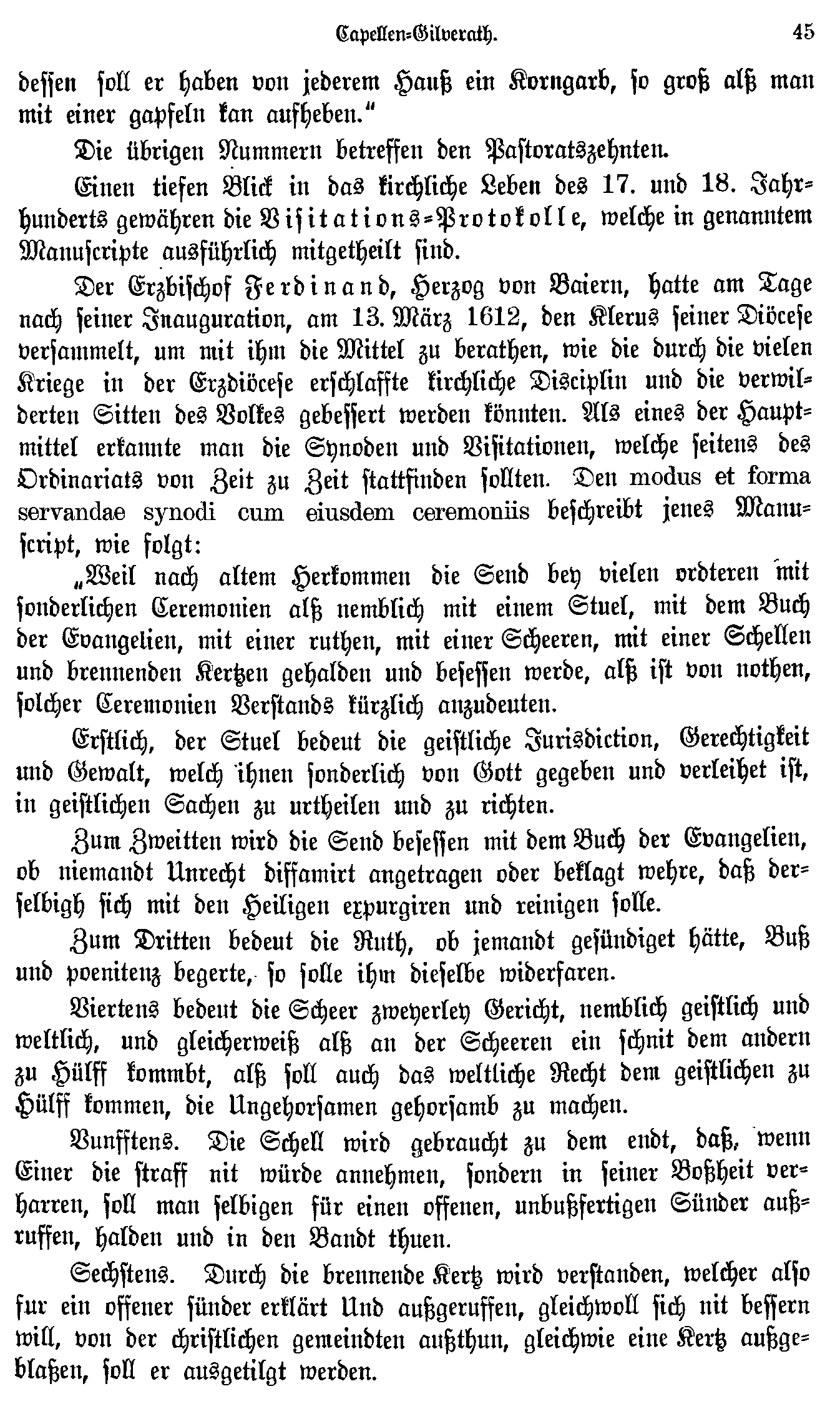 Der Erzbischof Ferdinand, Herzog von Baiern, hatte am Tage nach seiner Inauguration, am 13. März 1612, den Klerus seiner Diöcese versammelt, um mit ihm die Mittel zu berathen, wie die durch die vielen Kriege in der Erzdiöcese erschlaffte kirchliche Disciplin und die verwilderten Sitten des Volkes gebessert werden könnten. Als eines der Hauptmittel erkannte man die Synoden und Visitationen, welche seitens des Ordinariats von Zeit zu Zeit stattfinden sollten. Den modus et forma servandae synodi cum eiusdem ceremoniis beschreibt jenes Manuscript, wie folgt: