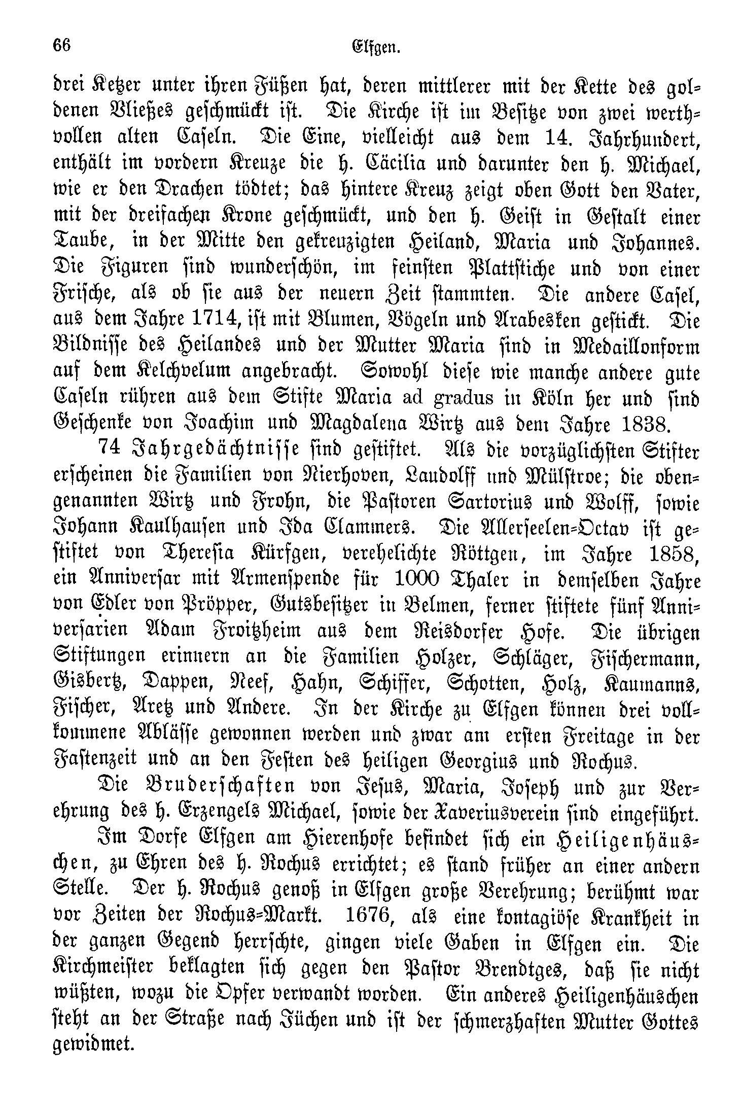 74 Jahrgedächtnisse sind gestiftet. Als die vorzüglichen Stifter erscheinen die Familien von Nierhoven, Laudolff und Mülstroe; die obengenannten Wirtz und Frohn, die Pastoren Sartorius und Wolff, sowie Johann Kaulhausen und Ida Clammers. Die Allerseelen=Octab ist gestiftet von Theresia Kürfgen, verehelichte Röttgen, im Jahre 1858, ein Anniversar mit Armenspende für 1000 Thaler in demselben Jahre von Edler von Pröpper, Gutsbesitzer in Belmen, ferner stiftete fünf Anniversarien Adam Froitzheim aus dem Reisdorfer Hofe. Die übrigen Stiftungen erinnern an die Familien Holzer, Schläger, Fischermann, Gisbertz, Dappen, Neef, Hahn, Schiffer, Schotten, Holz, Kaumanns, Fischer, Aretz und Andere. In der Kirche zu Elfgen können drei vollkommene Ablässe gewonnen werden und zwar am ersten Freitage in der Fastenzeit und an den Festen des heiligen Georgius und Rochus.