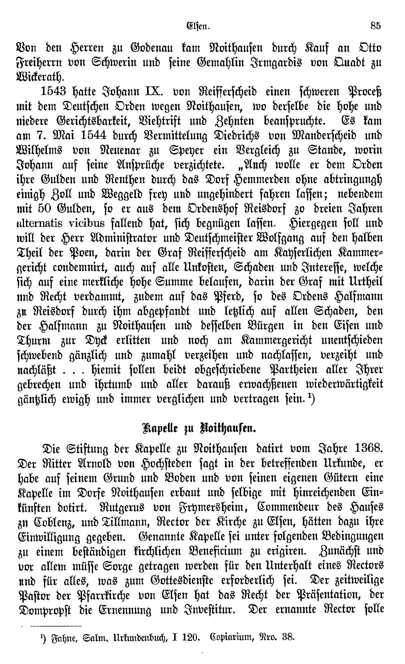 Die Stiftung der Kapelle zu Noithausen datirt vom Jahre 1368. Der Ritter Arnold von Hochsteden sagt in der betreffenden Urkunde, er habe auf seinem Grund und Boden und von seine eigenen Gütern eine Kapelle im Dorfe Noithausen erbaut und selbige mit hinreichenden Einkünften dotirt. Rutgerus von Frymersheim, Comthur des Hauses zu Coblenz, und Tillmann, Rector der Kirche zu Elsen, hätten dazu ihre Einwilligung gegeben. Genannte Kapelle sei unter folgenden Bedingungen zu einem beständigen kirchlichen Beneficium zu erigiren. Zunächst und vor allem müsse Sorge getragen werden für den Unterhalt eines Rectors und für alles, was zum Gottesdienste erforderlcih sei. Der zeitweilige Pastor der Pfarrkirche von Elsen hat das Recht der Präsentation, der Dompropst der Ernennung und Investitur. Der ernannte Rector solle