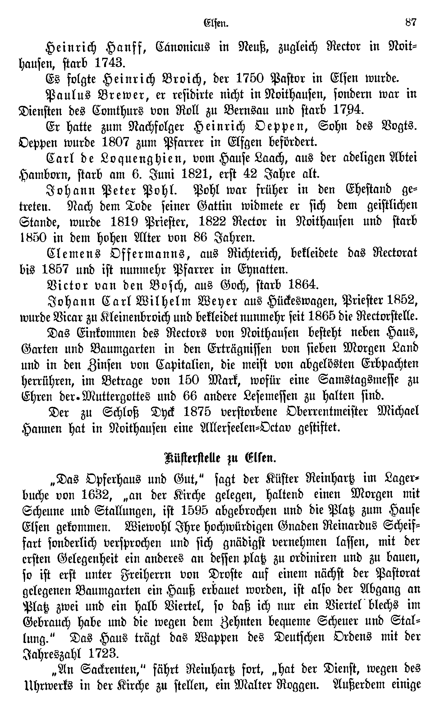 Das Einkommen des Rectors von Noithausen besteht neben Haus, Garten und Baumgarten in den Erträgnissen von sieben Morgen Land und in den Zinsen von Capitalien, die meist von abgelösten Erbpachten herrühren, im Betrage von 150 Mark, wofür eine Samstagmesse zu Ehren der Muttergottes und 66 andere Lesemessen zu halten sind.