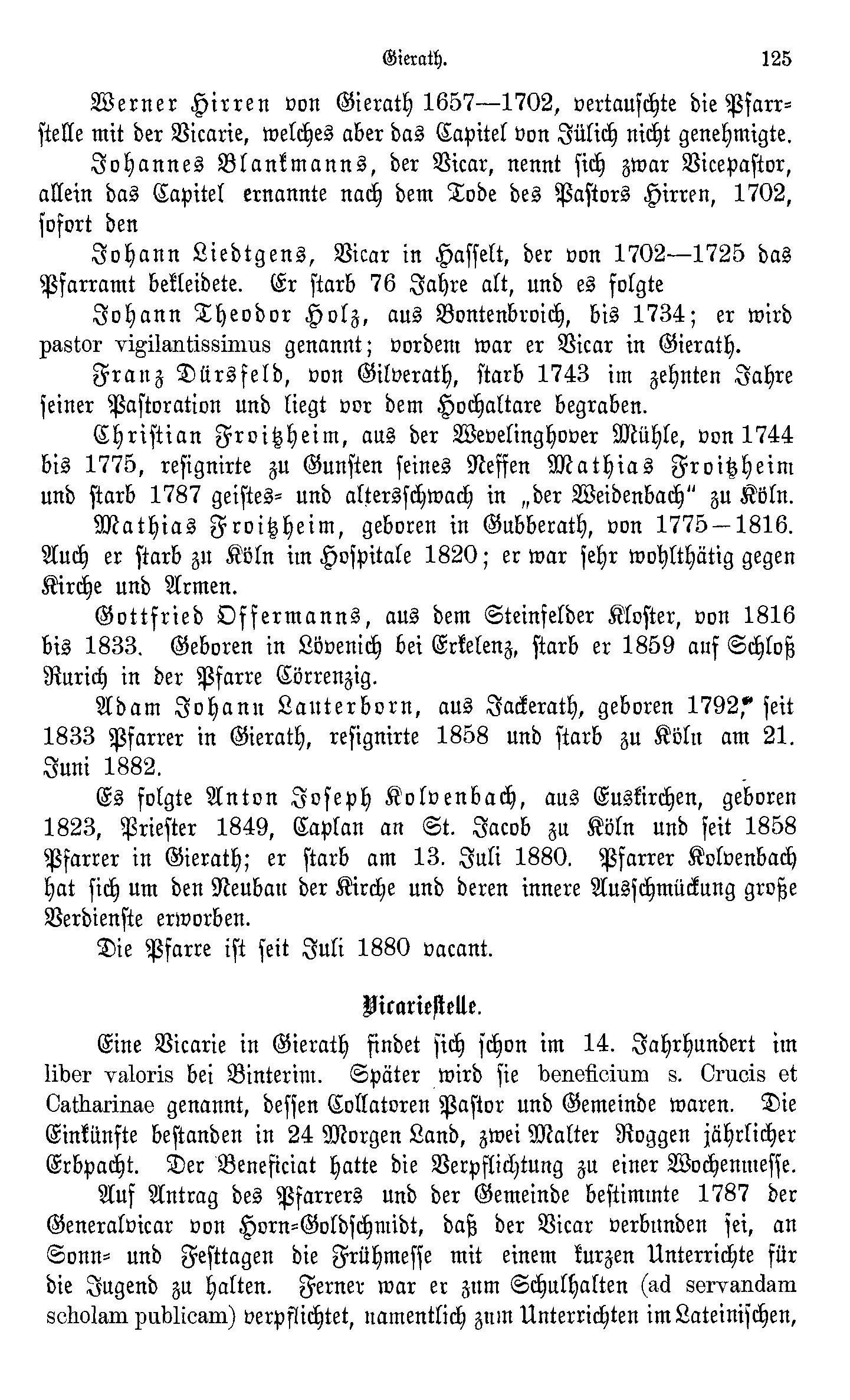 Werner Hirren von Gierath 1657-1702, vertauschte die Pfarrstelle mit der Vicarie, welches aber das Capitel von Jülich nicht genehmigte.