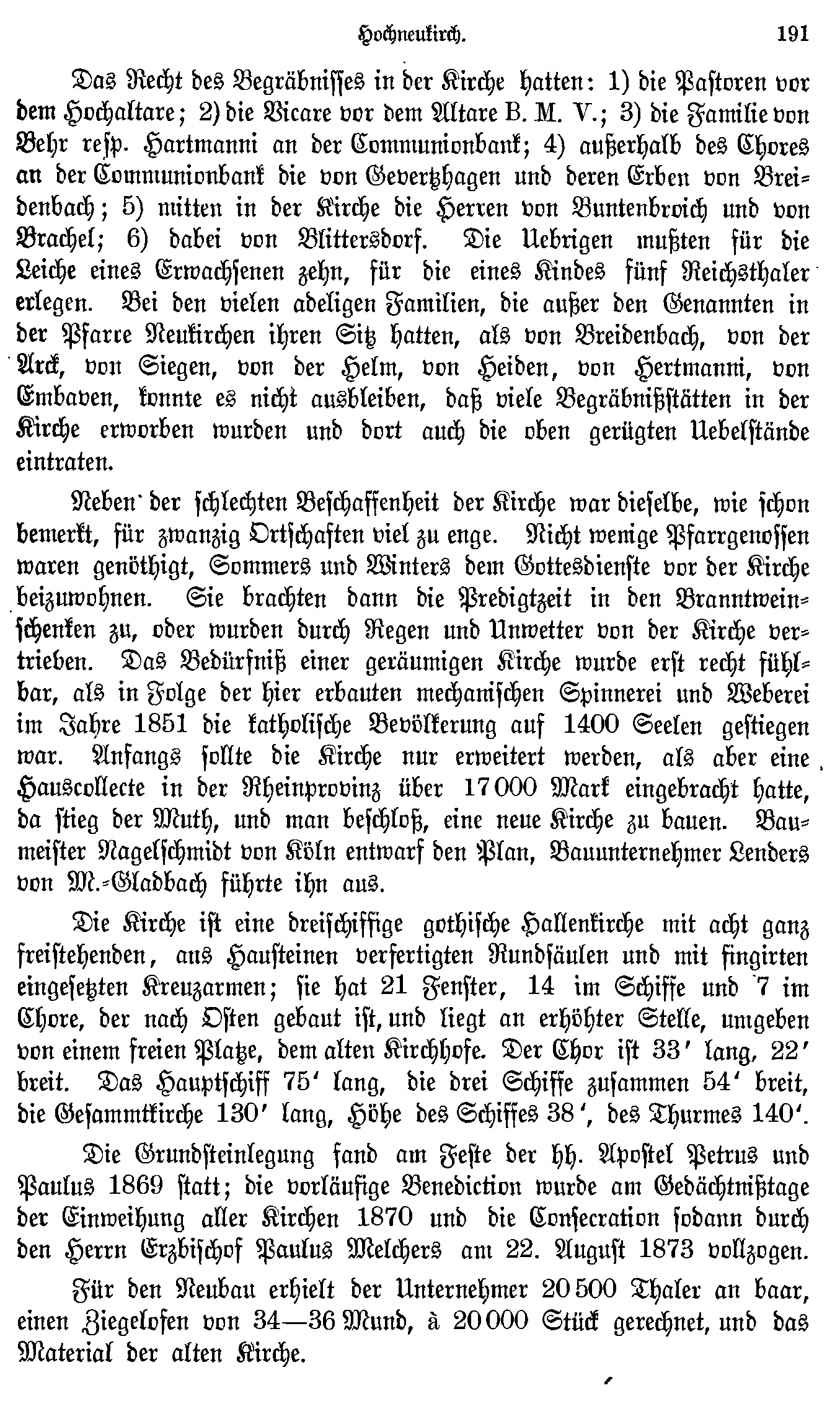 Das Recht des Begräbnisses in der Kirche hatten: 1) die Pastoren vor dem Hochaltare; 2) die Vicare vor dem Altare B. M. V.; 3) die Familie von Behr resp. Hartmanni an der Communionbank; 4) außerhalb des Chores an der Communionbank die von Gevertzhagen und deren Erben von Breidenbach; 5) mitten in der Kirche die Herren von Buntenbroich und von Brachel; 6) dabei von Blittersdorf. Die Uebrigen mußten für die Leiche eines Erwachsenen zehn, für die eines Kindes fünf Reichthaler erlegen. Bei den vielen adeligen Familien, die außer den Genannten in der Pfarre Neukirchen ihren Sitz hatten, als von Breidenbach, von der Arck, von Siegen, von der Helm, von Heiden, von Hertmanni, von Embaven, konnte es nicht ausbleiben, daß viel Begräbnißstätten in der Kirche erworben wurden und dort auch die oben gerügten Uebelstände eintraten.