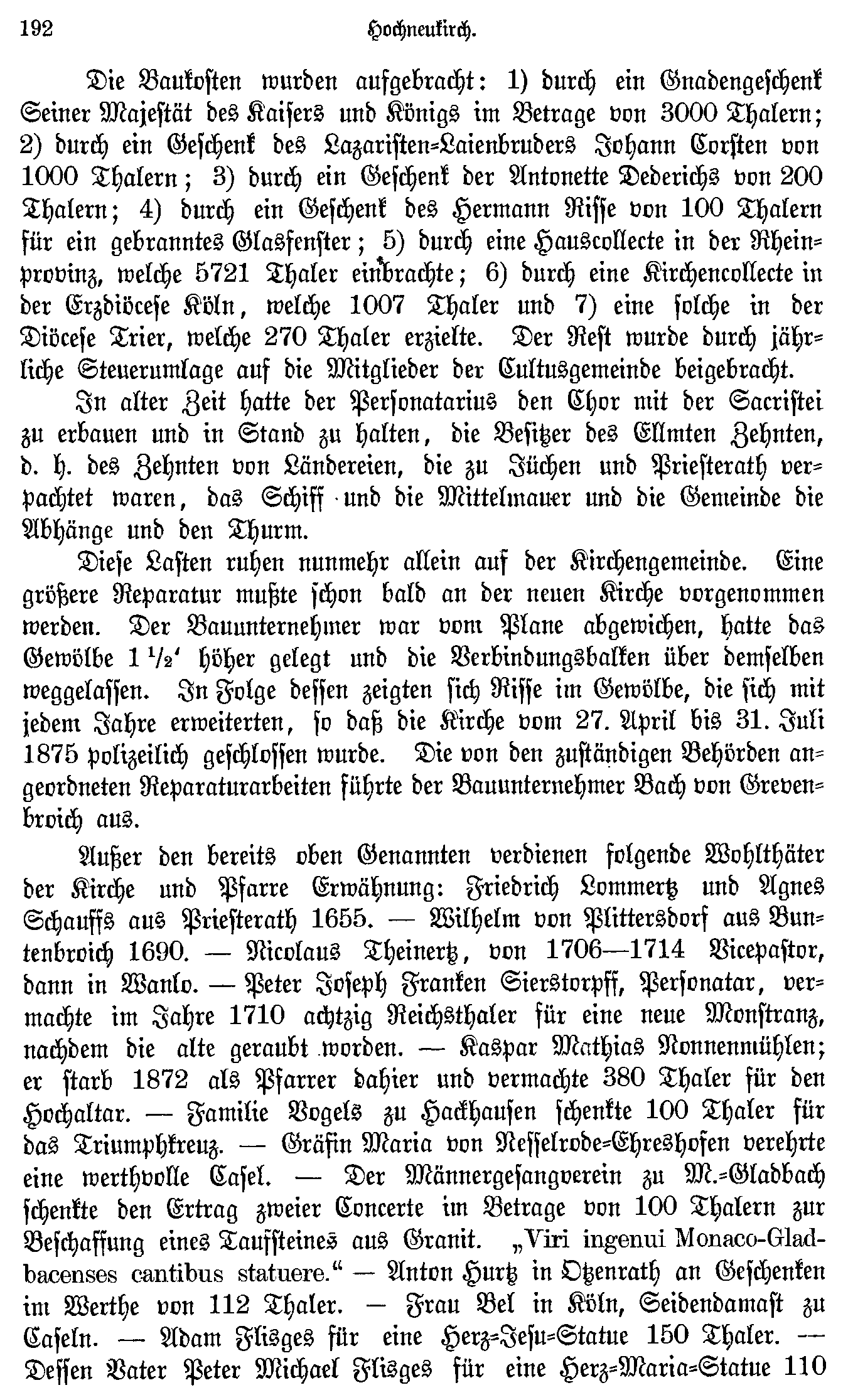 Die Baukosten wurden aufgebracht: 1) durch ein Gnadengeschenk Seiner Majestät des Kaisers und Königs im Betrage von 3000 Thalern; 2) durch ein Geschenk des Lazaristen=Laienbruders Johann Corsten von 1000 Thalern; 3) durch ein Geschenk der Antonette Dederichs von 200 Thalern; 4) durch ein Geschenk des Hermann Risse von 100 Thalern für ein gebranntes Glasfenster; 5) durch eine Hauscollecte in der Rheinprovinz, welche 5721 Thaler einbrachte; 6) durch eine Kirchencollecte in der Erzdiöcese Köln, welche 1007 Thaler und 7) eine solche durch jährliche Steuerumlage auf die Mitglieder der Cultusgemeinde beigebracht.