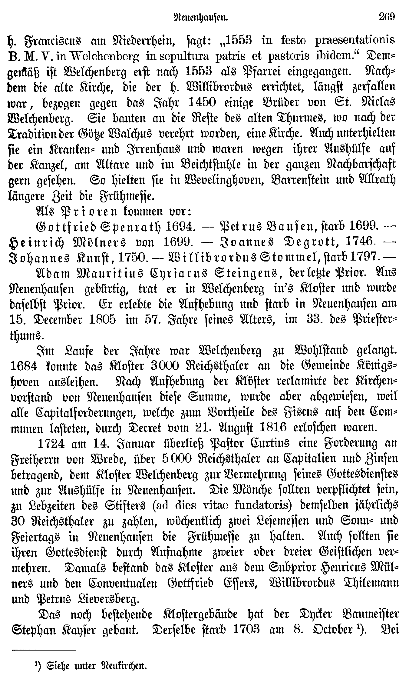 Adam Mauritius Cyriacus Steingens, der letzte Prior. Aus Neuenhausen gebürtig, trat er in Welchenberg in's Kloster und wurde daselbst Prior. Er erlebte die Aufhebung und starb in Neuenhausen am 15. December 1805 im 57. Jahre seines Alters, im 33. des Priesterthums.