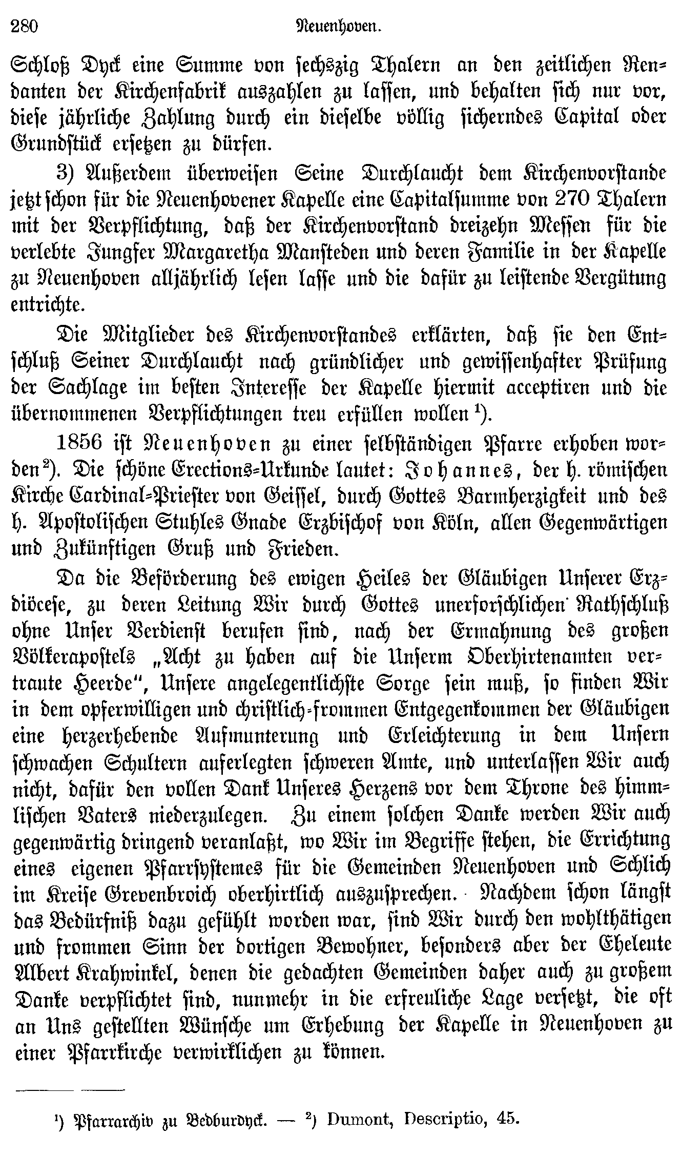 Die Mitglieder des Kirchenvorstandes erklärten, daß sie den Entschluß Seiner Durchlaucht nach gründlicher und gewissenhafter Prüfung der Sachlage im besten Interesse der Kapelle wollen.[1] 1856 ist Neuenhoven zu einer selbständigen Pfarre erhoben worden.[2] Die schöne Erections=Urkunde lautet: Johannes, der h. römischen Kirche Cardinal=Priester von Geissel, durch Gottes Barmherzigkeit und des h. Apostolischen Stuhles Gnade Erzbischof von Köln, allen Gegenwärtigen und Zukünftigen Gruß und Friesen.