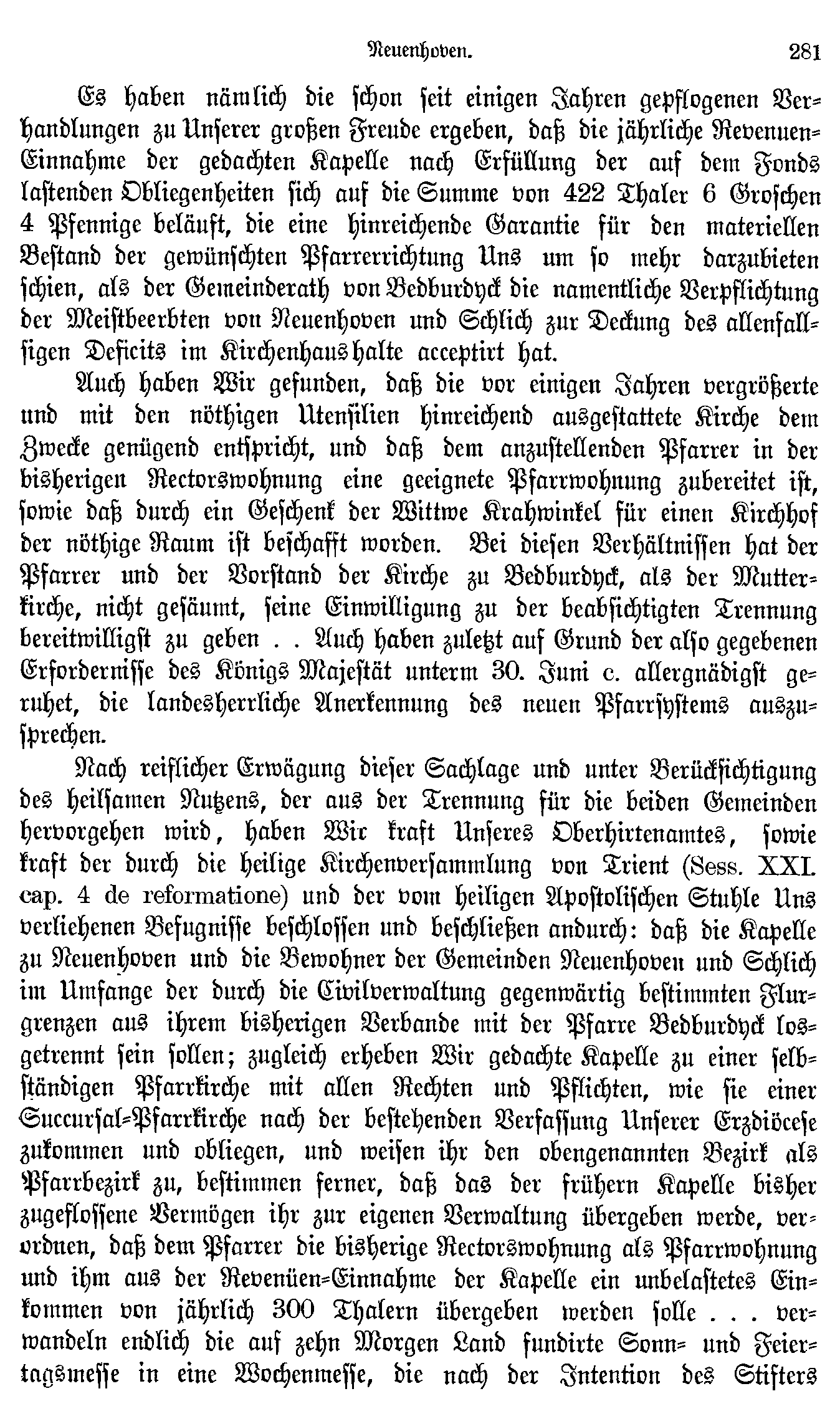 Nach reiflicher Erwägung dieser Sachlage und unter Berücksichtigung des heilsamen Nutzens, der aus der Trennung für die beiden Gemeinden hervorgehen wird, haben Wir kraft Unseres Oberhirtenamtes, sowie kraft der durch die heilige Kirchenversammlung von Trient (Sess. XXL cap. 4 de reformatioene) und der vom heiligen Apostolischen Stuhle Uns verliehenen Befugnisse beschlossen und beschließen andurch: daß die Kapelle zu Neuenhoven und die Bewohner der Gemeinden Neuenhoven und Schlich im Umfange der durch die Civilverwaltung gegenwärtig bestimmten Flurgrenzen aus ihrem bisherigen Verbande mit der Pfarre Bedburdyck losgetrennt sein sollen; zugleich erheben Wir gedachte Kapelle zu einer selbständigen Pfarrkirche mit allen Rechten und Pflichten, wie sie einer Succursal=Pfarrkiche nach der bestehenden Verfassunf Unserer Erzdiöcese zukommen und obliegen, und weisen ihr den obengenannten Bezirk als Pfarrbezirk zu, bestimmen ferner, daß das der frühern Kapelle bisher zugefolssenen Vermögen ihr zur eigenen Verwaltung übergeben werde, verordnen, daß dem Pfarrer die bisherige Rectorswohnung als Pfarrwohnung und ihm aus der Revenüen=Einnahme der Kapelle ein unbelastetes Einkommen von jährlich 300 Thalern übergeben werden solle … verwandeln endlich die auf zehn Morgen Land fundirte Sonn= und Feiertagsmesse in eine Wochenmesse, die nach der Intention des Stifters