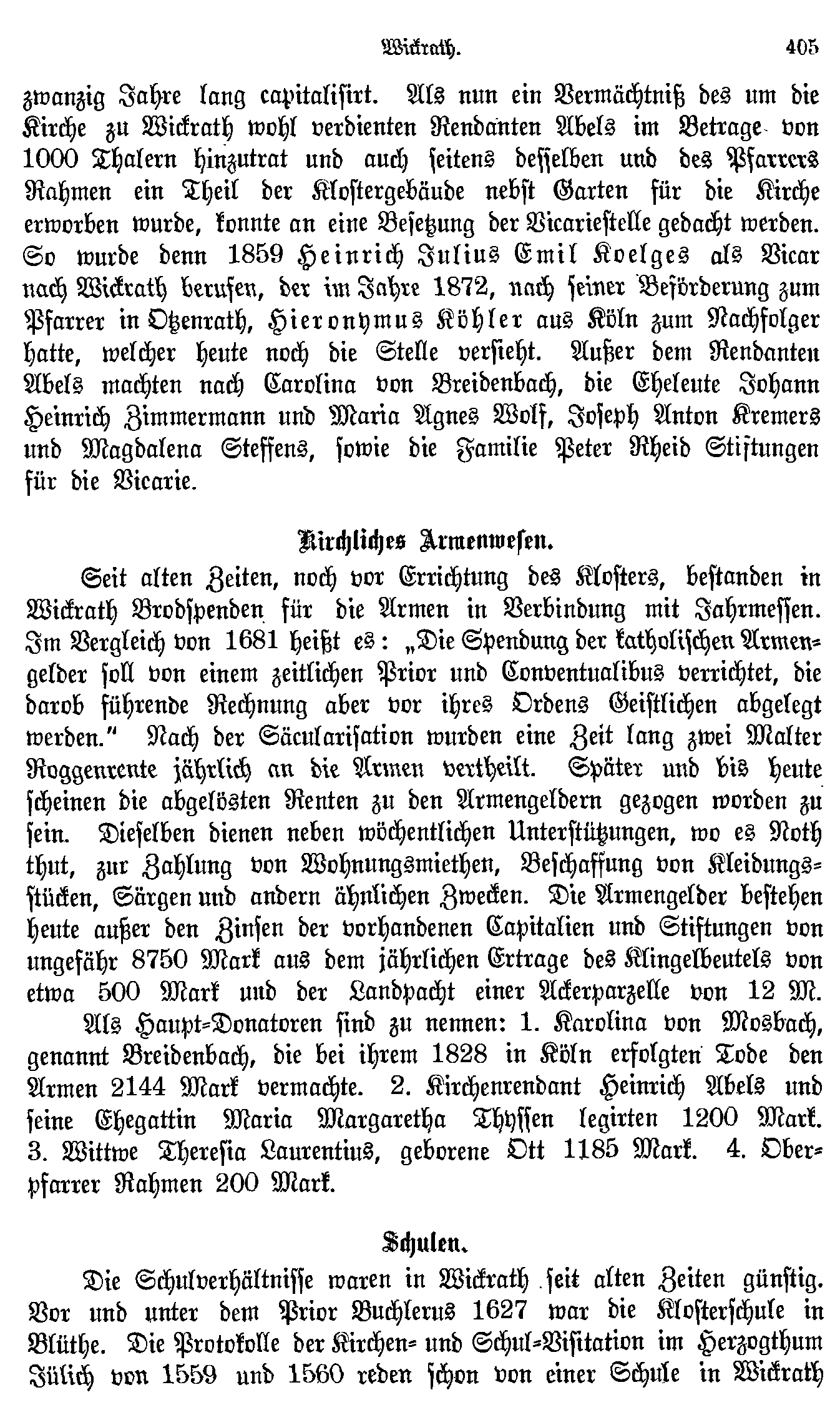 Jahre lang capitalisirt. Als nun ein Vermächtniß des um die Kirche zu Wickrath wohl verdienten Rendanten Abels im Betrage von 1000 Thalern hinzutrat und auch seitens desselben und des Pfarrers Rahmen ein Theil der Klostergebäude nebst Garten für die Kirche erworben wurde, konnte an eine Besetzung der Vicariestelle gedacht werden. So wurde denn 1859 Heinrich Julius Emil Koelges als Vicar nach Wickrath berufen, der im Jahre 1872, nach seiner Beförderung zum Pfarrer in Otzenrath, Hieronymus Köhler aus Köln zum Nachfolger hatte, welcher heute noch die Stelle versieht. Außer dem Rendanten Abels machten nach Carolina von Breidenbach, die Eheleute Johann Heinrich Zimmermann und Maria Agnes Wolf, Joseph Anton Kremers und Magdalena Steffens, sowie die Familie Peter Rheid Stiftungen für die Vicarie.