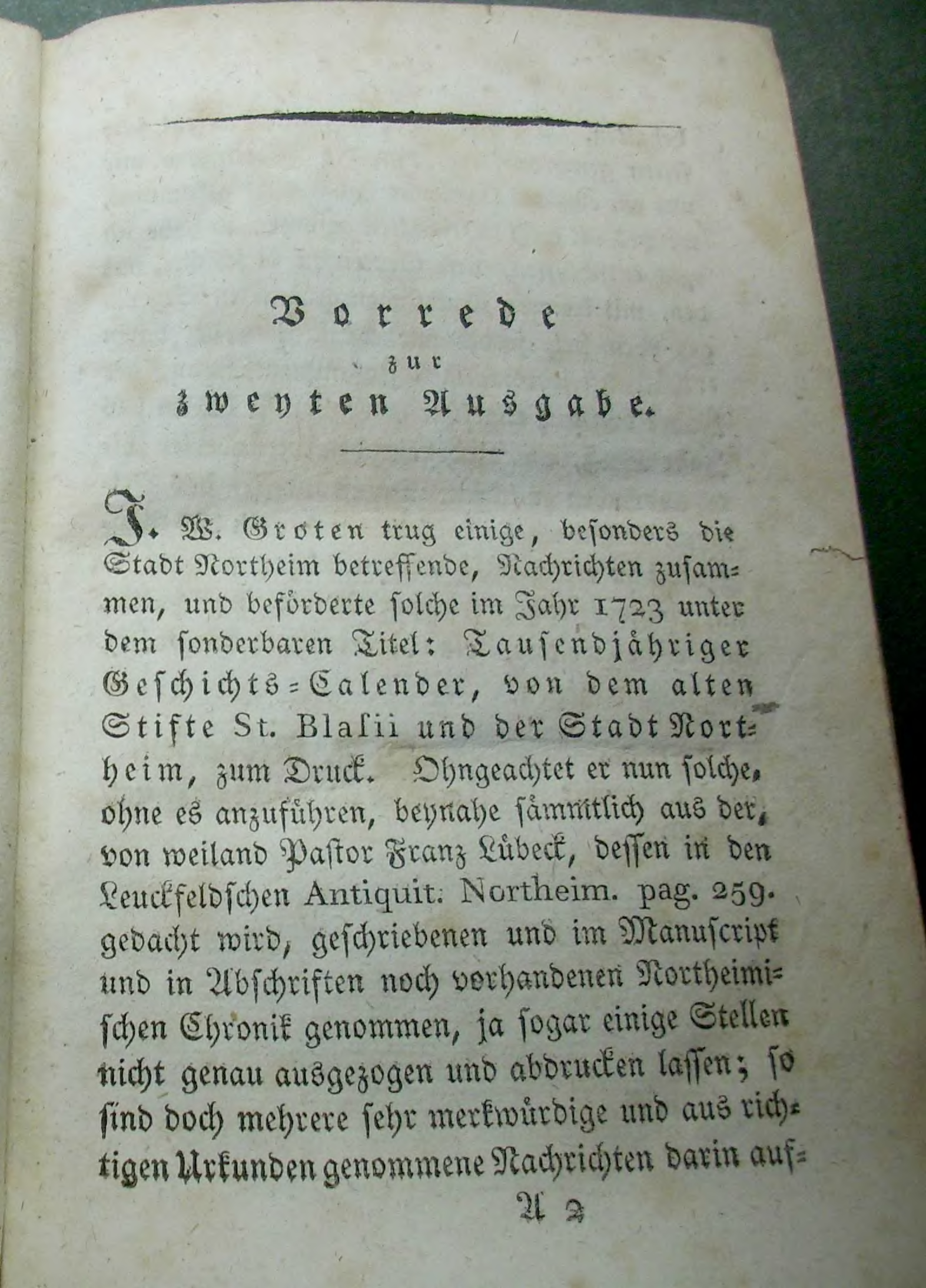 J. W. Groten trug einige, besonders die Stadt Northeim betreffende, Nachrichten zusammen, und beförderte solche im Jahr 1723 unter dem sonderbaren Titel: Tausendjähriger Geschichts-Calender, von dem alten Stifte St. Blasii und der Stadt Northeim, zum Druck. Ohngeachtet er nun solche, ohne es anzuführen, beinahe sämmtlich aus der, von weiland Pastor Franz Lübeck, dessen in den Leuckfeldschen Antiquit. Northeim. pag. 259. gedacht wird, geschrieben und im Manuscript und in Abschriften noch vorhandenen Northeimischen Chronik genommen, ja sogar einige Stellen nicht genau ausgezogen und abdrucken lassen; so sind doch mehrere sehr merkwürdige und aus richtigen Urkunden genommene Nachrichten darin aufbehalten.