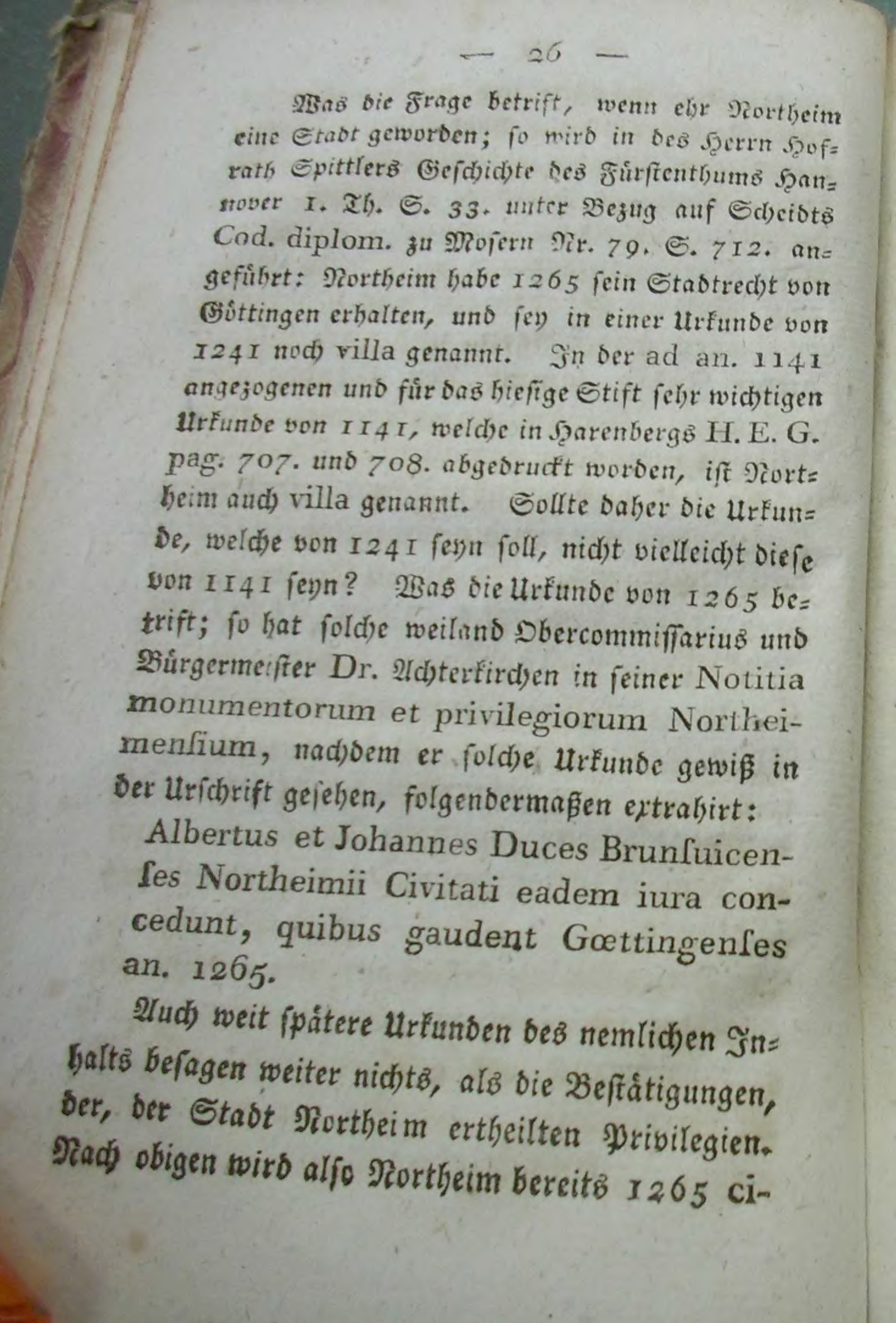 Was die Frage betrift, wenn ehr Northeim eine Stadt geworden; so wird in des Herrn Hofrath Spittlers Geschichte des Fürstenthums Hannover I. Th. S. 33. unter Bezug auf Scheidts Cod. diplom. zu Mosern Nr. 79. S. 712. angeführt: Northeim habe 1265 sein Stadtrecht von Göttingen erhalten, und sey in einer Urkunde von 1241 noch villa genannt. In der ad an. 1141 angezogenen und für das hiesige Stift sehr wichtigen Urkunde von 1141, welche in Harenbergs H. E. G. pag. 707. und 708. abgedruckt worden, ist Northeim auch villa genannt. Sollte daher die Urkunde, welche von 1241 seyn soll, nicht vielleicht diese 1141 seyn ? Was die Urkunde von 1265 betrift; so hat solche weiland Obercommissarius und Bürgermeister Dr. Achterkirchen in seiner Notitia monumentorum et privilegiorum Northeimensium, nachdem er solche Urkunde gewiß in der Urschrift gesehen, folgender maßen extrahirt: