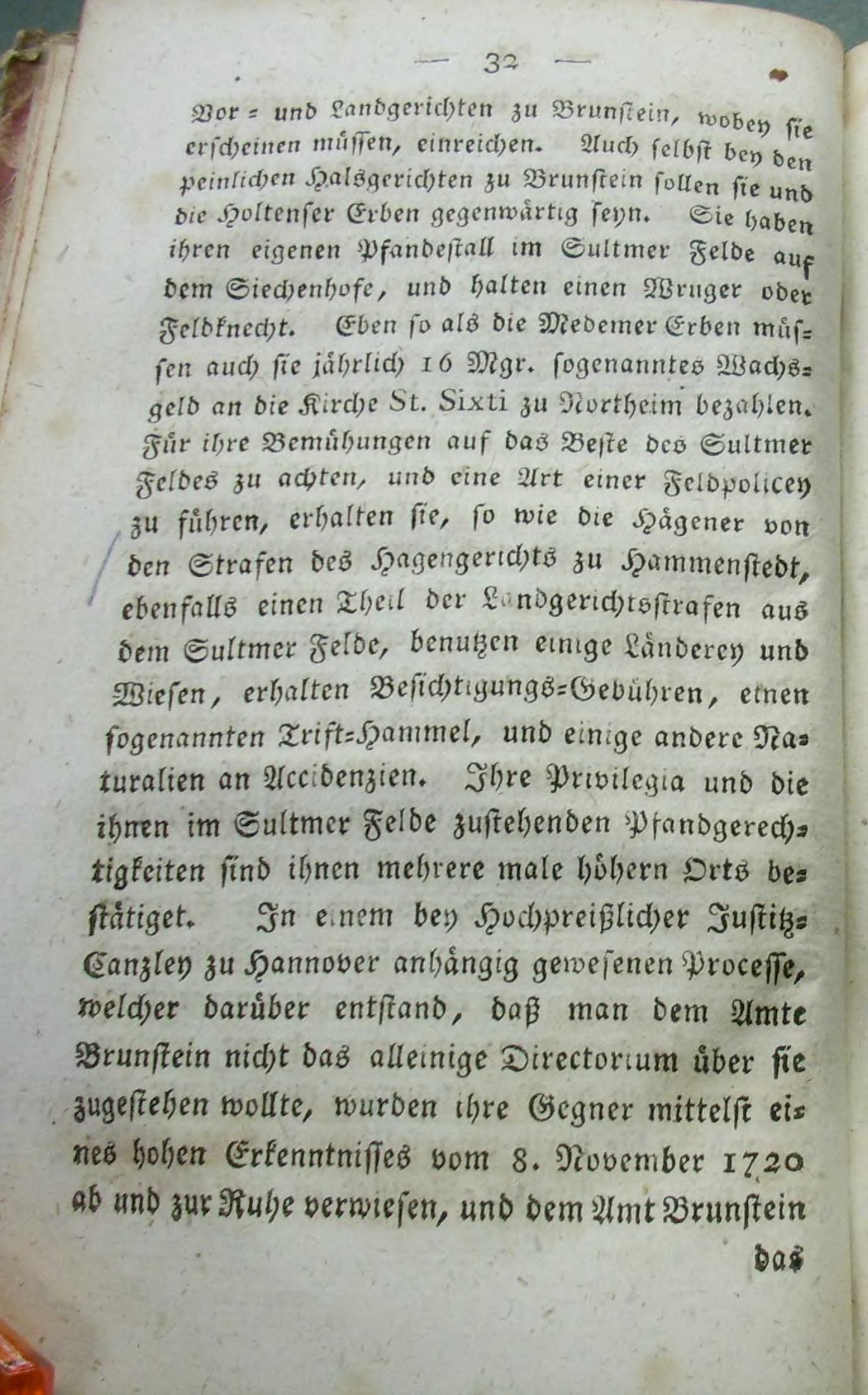 Vor- und Landgerichten zu Brunstein, wobey sie erscheinen müssen, einreichen. Auch selbst bey den peinlichen Halsgerichten zu Brunstein sollen sie und den Holtenser Erben gegenwärtig seyn. Sie haben ihren eigenen Pfandestall im Sultmer Felde auf dem Siechenhofe, und halten einen Wruger oder Feldknecht. Eben so als die Medemer erben müssen auch sie jährlich 16 Mgr. sogenanntes Wachsgeld an die Kirche St. Sixti zu Northeim bezahlen. Für ihre Bemühungen auf das Beste des Sultmer Feldes zu achten, und eine Art einer Feldpolicey zu führen, erhalten sie, so wie die Hägener von den Strafen des Hagengerichts zu Hammenstedt, ebenfalls einen Theil der Landgerichtsstrafen aus dem Sultmer Felde, benutzen einige Länderey und Wiesen, erhalten Besichtigungs-Gebühren, einen sogenannten Trift-Hammel, und einige Naturalien an Accidenzien. Ihre Privilegia und die ihnen im Sultmer Felde zustehenden Pfandgerechtigkeiten sind ihnen mehrere male höhern Orts bestätigt. In einem bey Hochpreißlicher Justitz-Canzley zu Hannover anhängig gewesenen Processe, welcher darüber entstand, daß man dem Amte Brunstein nicht das alleinige Directorium über sie zugestehen wollte, wurden ihre Gegner mittelst eines hohen Erkenntnisses vom 8. November 1720 ab und zur Ruhe verwiesen, und dem Amt Brunstein