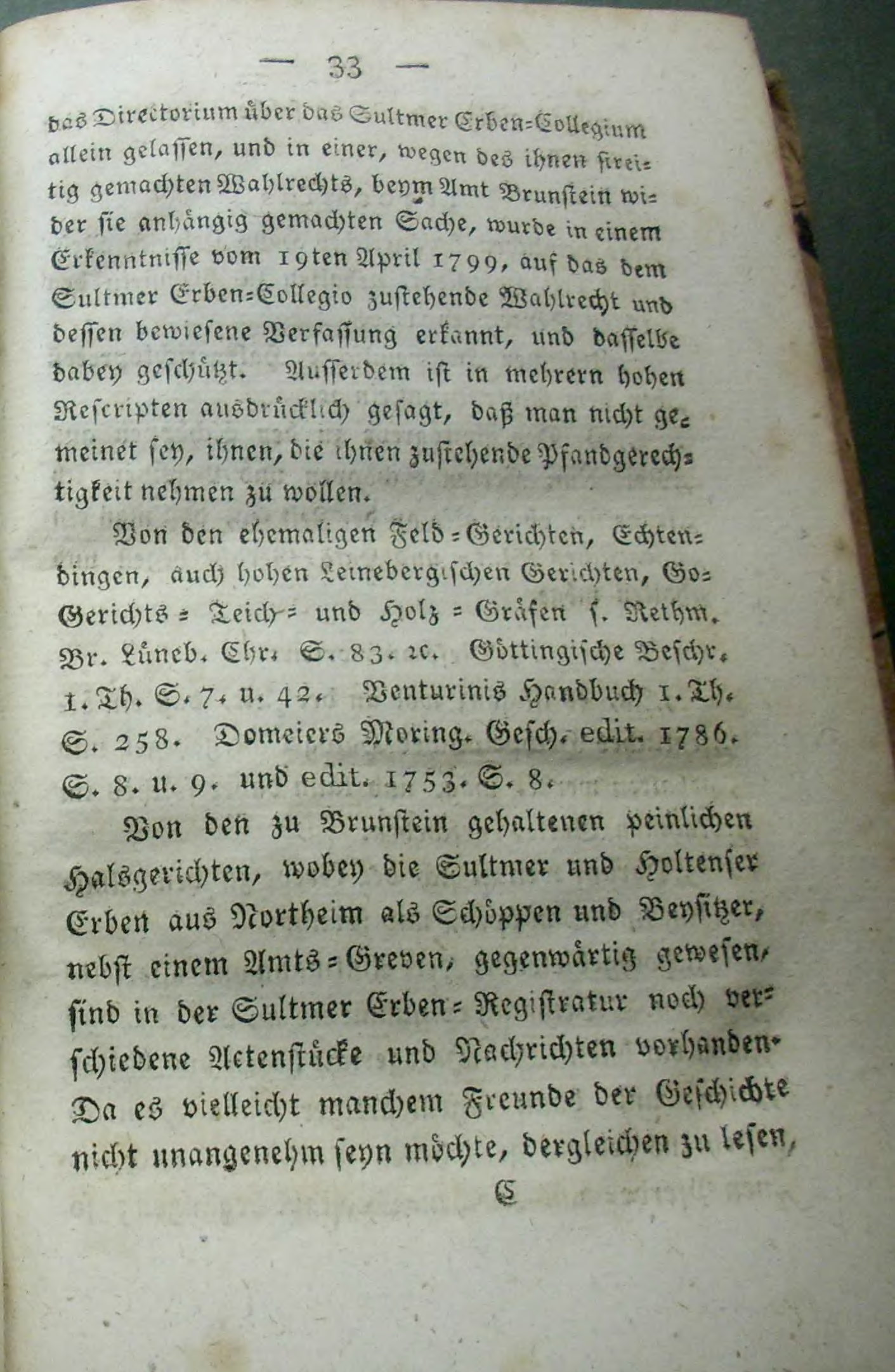 das Directorium über das Sultmer Erben-Collegium allein gelassen, und in einer, wegen des ihnen streitig gemachten Wahlrechts, beym Amt Brunstein wider sie anhängig gemachten sache, wurde in einem Erkenntnisse vom 19ten April 1799, auf das dem Sultmer Erben-Collegio zustehende Wahlrecht und dessen bewiesene Verfassung erkannt, und dasselbe dabey geschützt. Ausserdem ist in mehrern hohen Rescripten ausdrücklich gesagt, daß man nicht gemeinet sey, ihnen, die ihnen zustehende Pfandgerechtigkeit nehmen zu wollen.