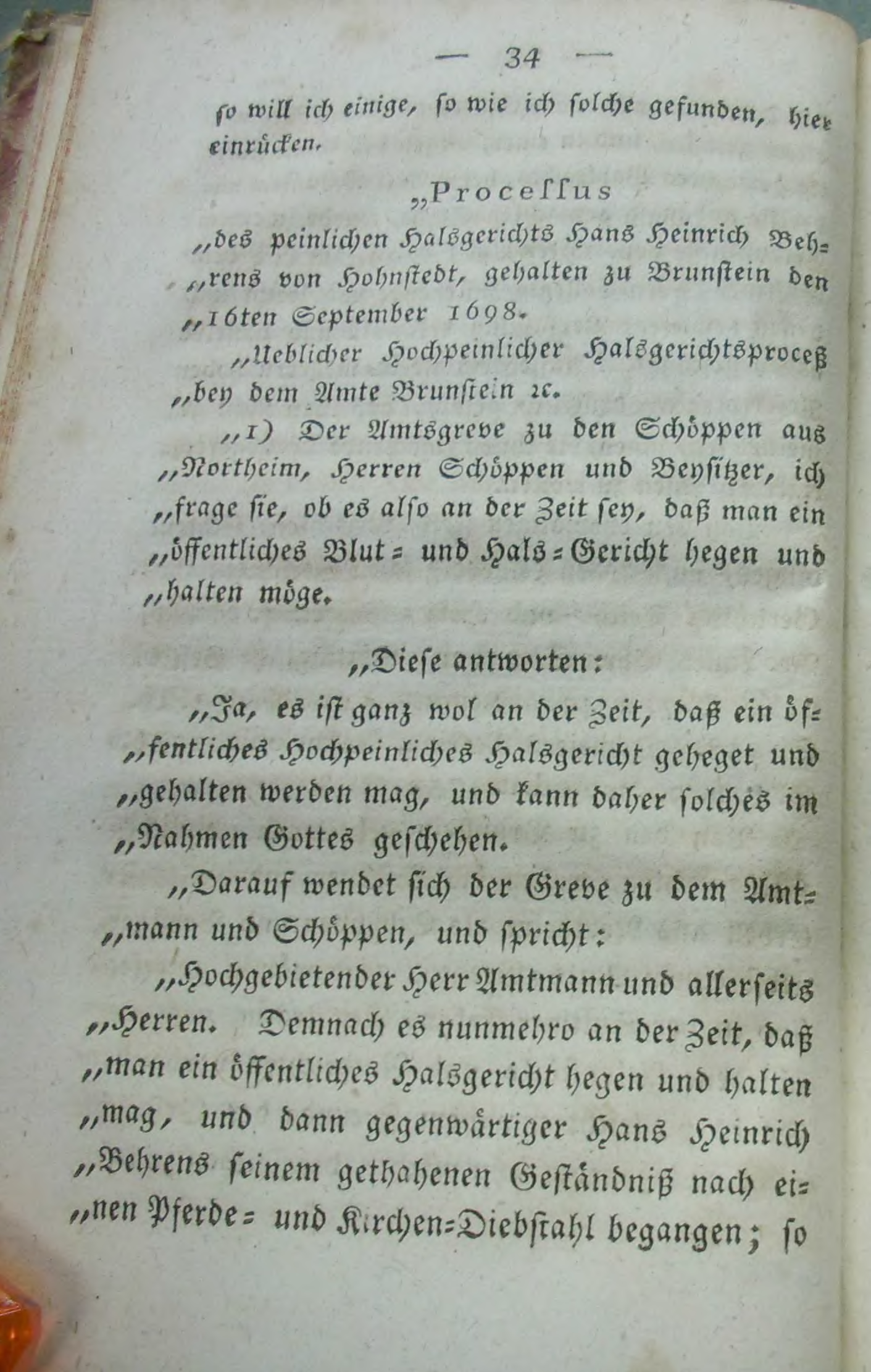 Hochgebietender Herr Amtmann und allerseits Herren. Demnach es nunmehro an der Zeit, daß man ein öffentliches Halsgericht hegen und halten mag, und dann gegenwärtiger Hans Heinrich Behrens seinem gethanenen Geständniß nach einen Pferde- und Kirchen-Diebstahl begangen; so