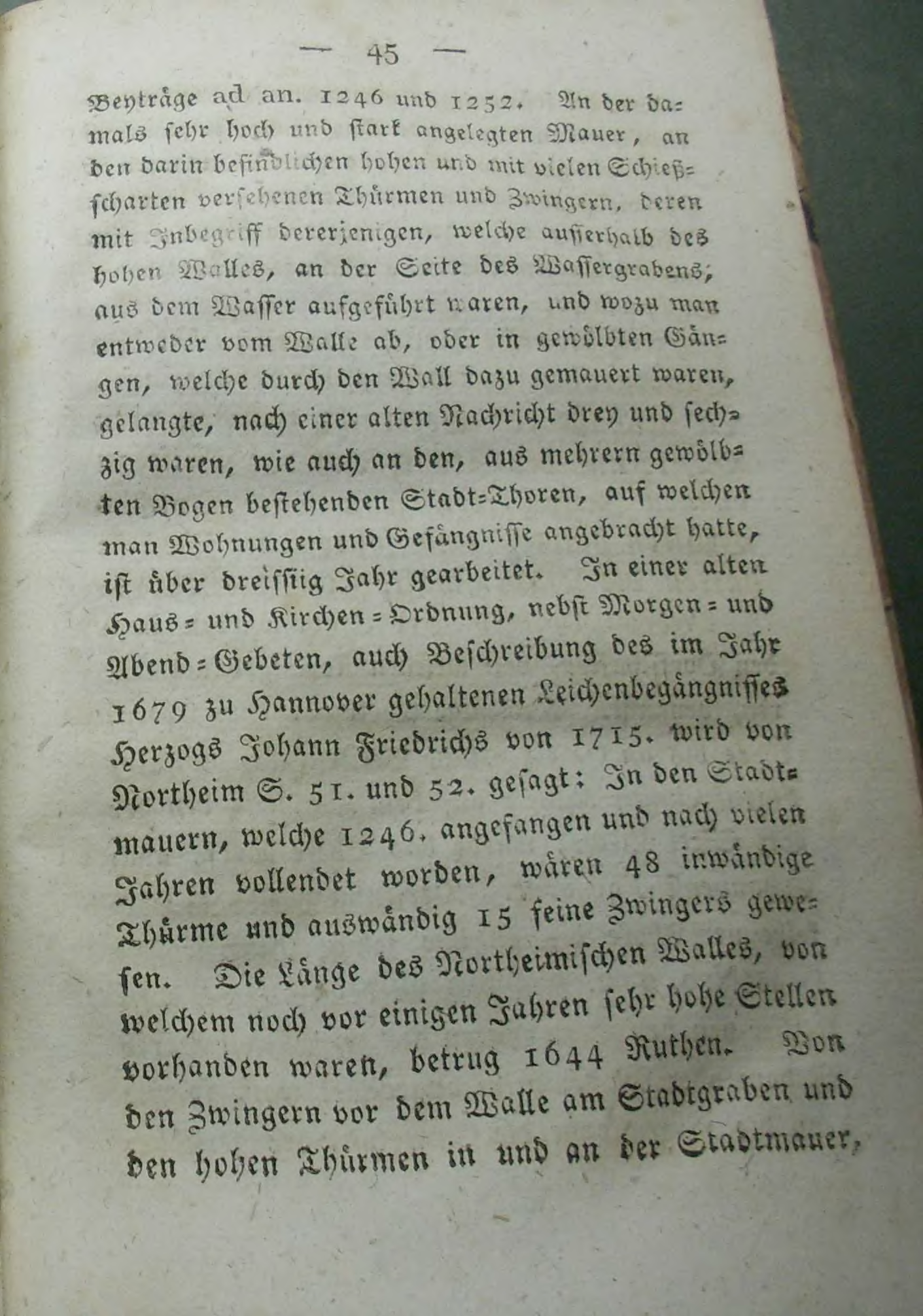 Beyträge ad an. 1246 und 1252. An der damals sehr hoch und stark angelegten Mauer, an den darin befindlichen hohen und mit vielen Schießscharten versehenen Thürmen und Zwingern, deren mit Inbegriff dererjenigen, welche ausserhalb des hohen Walles, an der Seite des Wassergrabens; aus dem Wasser aufgeführt waren, und wozu man entweder vom Walle ab, oder in gewölbten Gängen, welche durch den Wall dazu gemauert waren, gelangte, nach einer alten Nachricht drey und sechszig waren, wie auch an den, aus mehrern gewölbten Bogen bestehenden Stadt-Thoren, auf welchen man Wohnungen und Gefängnisse angebracht hatte, ist über dreissig Jahr gearbeitet. In einer alten Haus- und Kirchen-Ordnung, nebst Morgen- und Abend-Gebeten, auch Beschreibung des im Jahr 1679 zu Hannover gehaltenen Leichenbegängnisses Herzogs Johann Friedrichs von 1715. wird von Northeim S. 51. und 52. gesagt: In den Stadtmauern, welche 1246. angefangen und nach vielen Jahren vollendet worden, wären 48 inwändige Thürme und auswändig 15 feine Zwingers gewesen. Die Länge des Northeimischen Walles, von welchem noch vor einigen Jahren sehr hohe Stellen vorhanden waren, betrug 1644 Ruthen. Von den Zwingern vor dem Walle am Stadtgraben und den hohen Thürmen in und an der Stadtmauer,