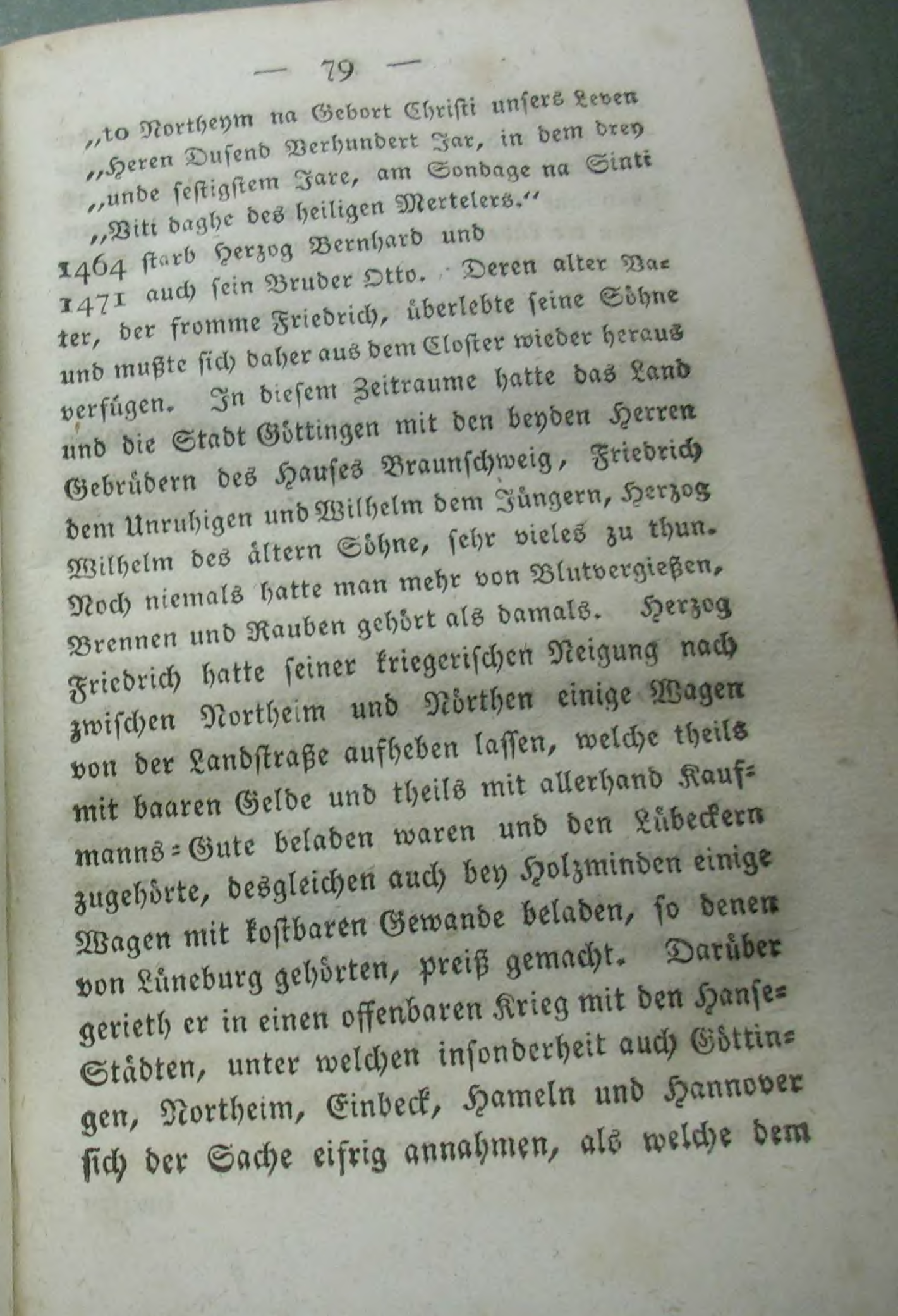 1471 auch sein Bruder Otto. Deren alter Vater, der fromme Friedrich, überlebte seine Söhne und mußte sich daher aus dem Closter wieder heraus verfügen. In diesem Zeitraume hatte das Land und die Stadt Göttingen mit den beyden Herren Gebrüdern des Hauses Braunschweig, Friedrich dem Unruhigen und Wilhelm dem Jüngern, Herzog Wilhelm des ältern Söhne, sehr vieles zu thun. Noch niemals hatte man mehr von Blutvergießen, Brennen und Rauben gehört als damals. Herzog Friedrich hatte seiner kriegerischen Neigung nach zwischen Northeim und Nörthen einige Wagen von der Landstraße aufheben lassen, welche theils mit baarem Gelde und theils mit allerhand Kaufmann-Gute beladen waren und den Lübeckern zugehörte, desgleichen auch bey Holzminden einige Wagen mit kostbaren Gewande beladen, so denen von Lüneburg gehörten, preiß gemacht. Darüber gerieth er in einen offenbaren Krieg mit den Hanse-Städten, unter welchen insonderheit auch Göttingen, Northeim, Einbeck, Hameln und Hannover sich der Sache eifrig annahmen, als welche dem