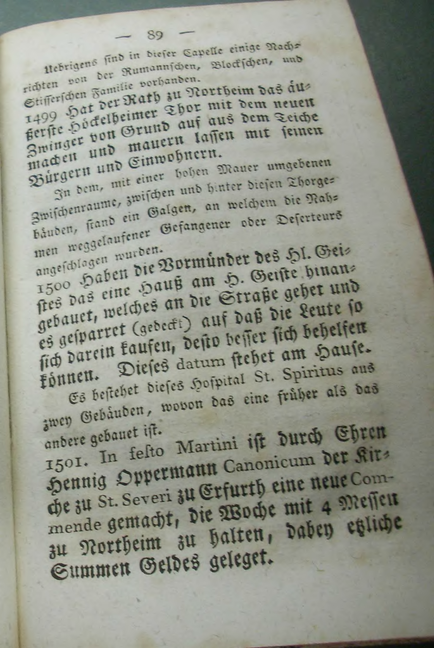 1501. In festo Martini ist durch Ehren Hennig Oppermann Canonicum der Kirche zu St. Severi zu Erfurth eine neue Commende gemacht, die Woche mit 4 Messen zu Northeim zu halten, dabey etzliche Summen Geldes geleget.