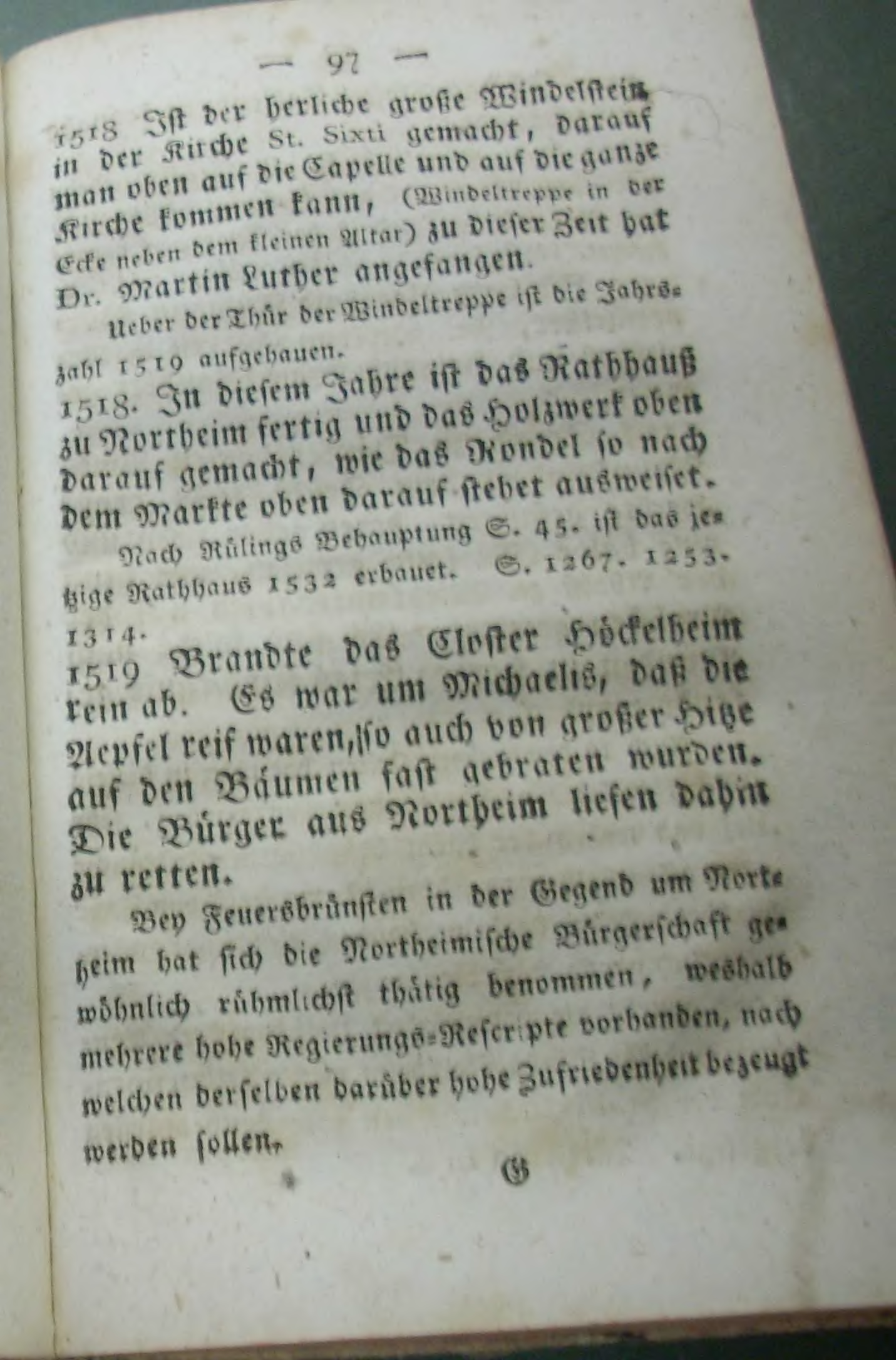 1519 Brandte das Closter Höckelheim rein ab. Es war um Michaelis, daß die Aepfel reif waren, so auch von großer Hitze auf den Bäumen fast gebraten wurden. Die Bürger aus Northeim liefen dahin zu retten.