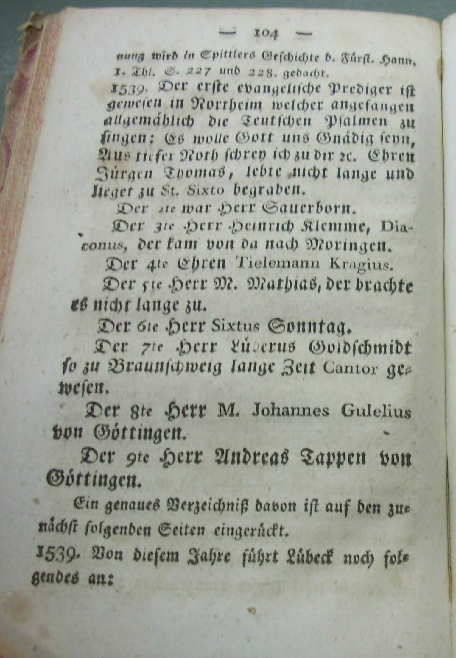 1539. Der erste evangelische Prediger ist gewesen in Northeim welcher angefangen allgemählich die Teutschen Psalmen zu singen: Es wolle Gott uns Gnädig seyn, Aus tiefer Noth schrey ich zu dir zc, Ehren Jürgen Thomas, lebte nicht lange und lieget zu St. Sixto begraben.