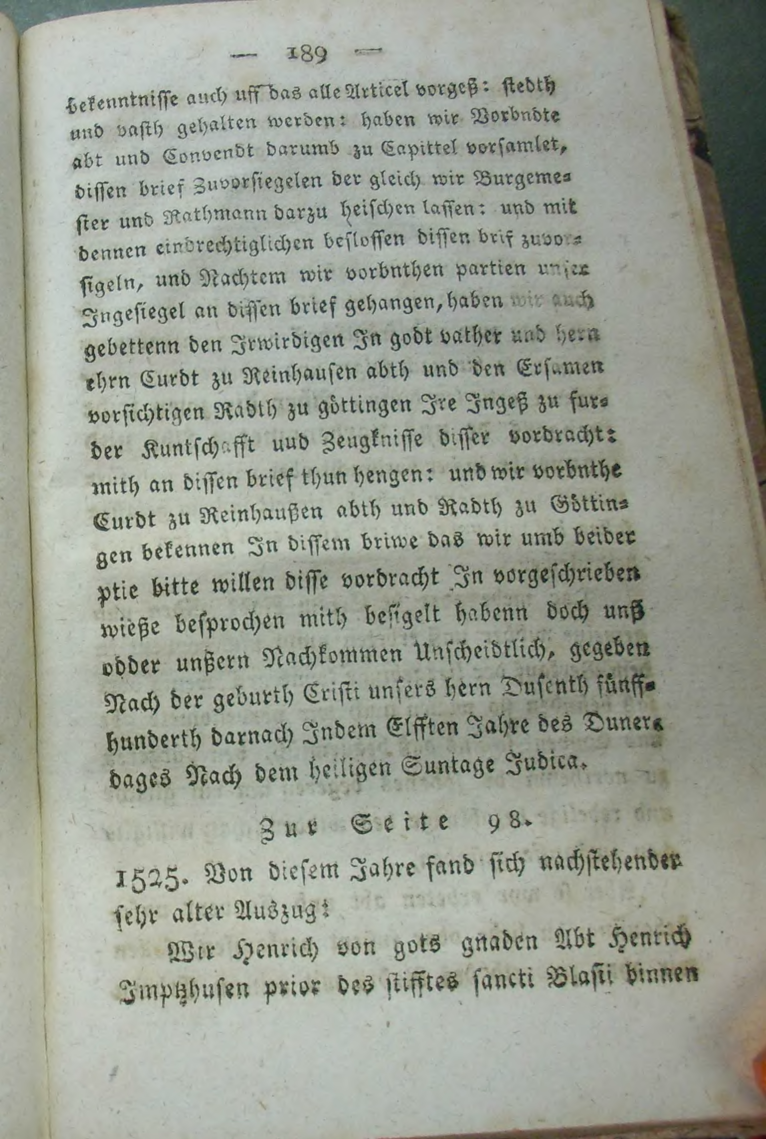 bekenntnisse auch uff das alle Articel vorgeß: stedth und vasth gehalten werden: haben wir Vorbndte abt und Convendt darumb zu Capittel vorsamlet, dissen brief Zuvorsiegelen der gleich wir Burgemester und Rathmann darzu heischen lassen: und mit dennen eindrechtiglichen beslossen dissen brif zuvorsigeln, und Nachten wir vorbnthen partien unser Ingesiegel an dissen brief gehangen, haben wir auch gebettenn den Irwirdigen In godt vather und hern ehrn Curdt zu Reinhausen abth und den Ersamen vorsichtigen Radt zu göttingen Ire Ingeß zu furder Kuntschafft und Zeugknisse disser vordracht: mith an dissen brief thun hengen: und wir vorbnthe Curdt zu Reinhaußen abth und Radth zu Göttingen bekennen In dissem briwe das wir umb beider ptie bitte willen disse vordracht In vorgeschrieben wieße besprochen mith besigelt habenn doch unß odder unßern Nachkommen Unscheidtlich, gegeben Nach der geburth Christi unsers hern Dusenth fünffhunderth darnach Indem Elfften Jahre des Dunersdages Nach dem heiligen Suntage Judica.