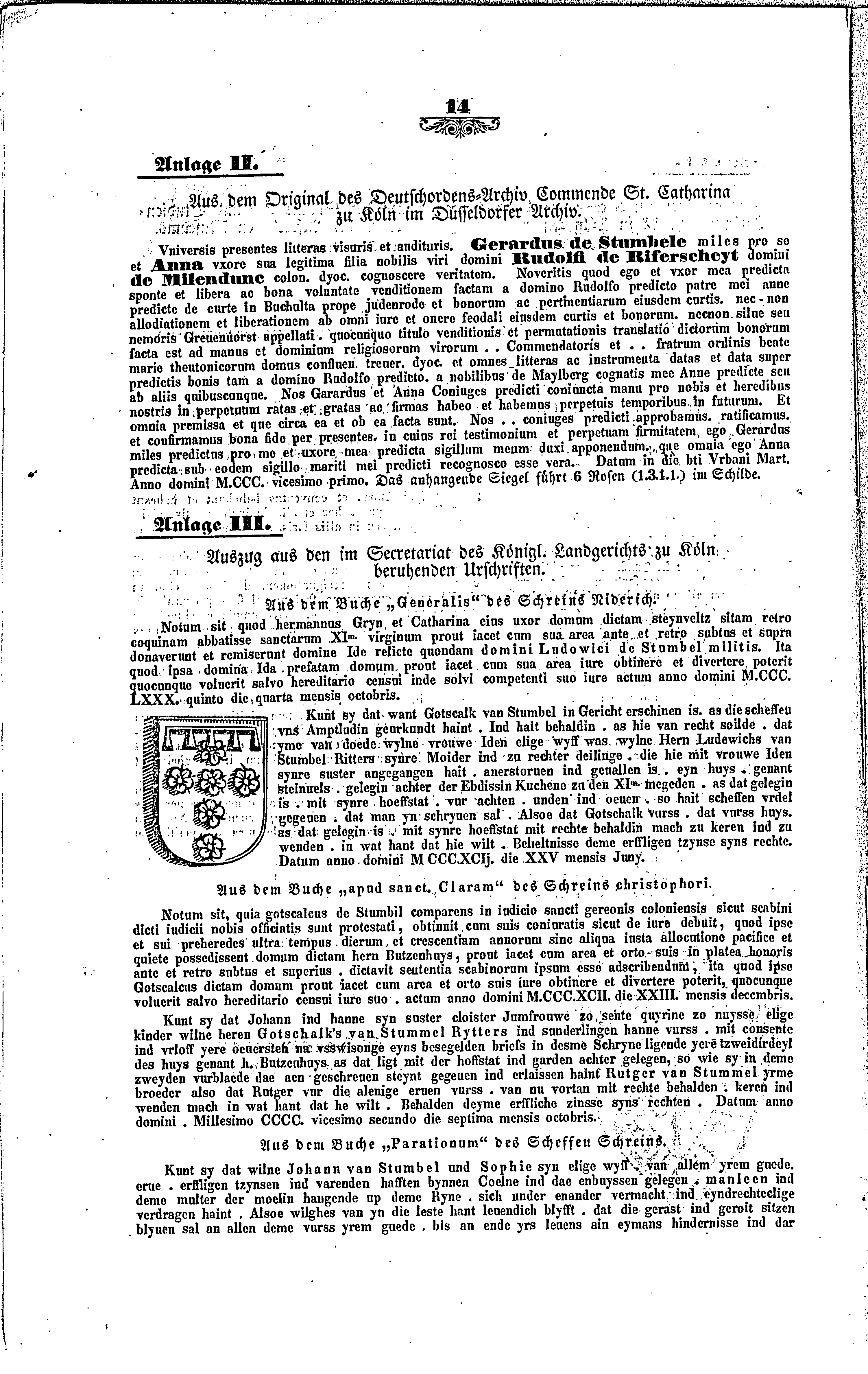 Vniversis presentes litteras visuris et audituris. Gerardus de Stumbele miles pro se et Anna vxore sua legitima filia nobilis viri domini Rudolfi de Riferscheyt domini de Milendunc colon. dyoc. cognoscere veritatem. Noveritis quod ego et vxor mea predicta sponte et libera ac bona voluntate venditionem factam a domino Rudolfo predicto patre mei anne predicte de curte in Buchulta prope judenrode et bonorum ac pertinentiarum eiusdem curtis. nec - non allodiationem et liberationem ab omni iure et onere feodali eiusdem curtis et bonorum. necnon silue seu nemoris Greuenuorst appellati. quocunquo titulo venditionis et permutationis translatio dictorum bonorum facta est ad manus et dominium religiosorum virorum . . Commendatoris et . . fratrum ordinis beate marie theutonicorum domus confluen. treuer. dyoc. et omnes litteras ac instrumenta datas et data super predictis bonis tam a domino Rudolfo predicto. a nobilibus de Maylberg cognatis mee Anne predicte seu ab aliis quibuscunque. Nos Garardus et Anna Coniuges predicti coniuncta manu pro nobis et heredibus nostris in perpetuum ratas et gratas ac firmas habeo et habemus perpetuis temporibus in futurum. Et omnia premissa et que circa ea et ob ca facta sunt. Nos . . coniuges predicti approbamus. ratificamus. et confirmamus bona fide per presentes. in cuius rei testimonium et perpetuam firmitatem ego Gerardus miles predictus pro me et uxore mea predicta sigillum meum duxi apponendum. que omnia ego Anna predicta sub eodem sigillo mariti mei predicti recognosco esse vera. Datum in die bti Vrbani Mart. Anno domini M.CCC. vicesimo primo. Das anhangende Siegel führt 6 Rosen (1.3.1.1.) im Schilde.