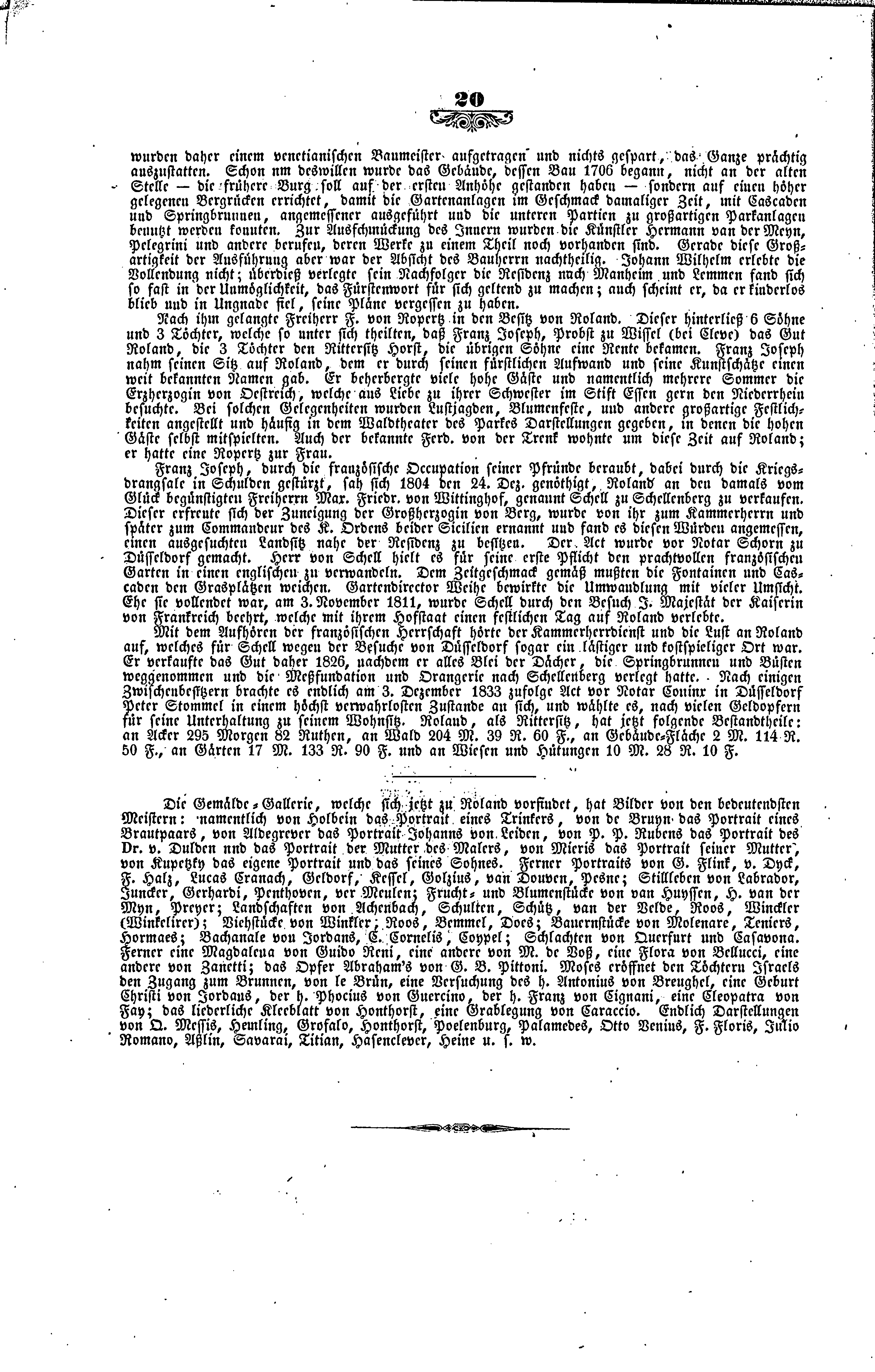 Mit dem Aufhören der französischen Herrschaft hörte der Kammerherrdienst und die Lust an Roland auf, welches für Schell wegen der Besuche von Düsseldorf sogar ein lästiger und kostspieliger Ort war. Er verkaufte das Gut daher 1826, nachdem er alles Blei der Dächer, die Springbrunnen und Büsten weggenommen und die Meßfundatiion und Orangerie nach Schellenberg verlegt hatte. Nach einigen Zwischenbesitzern brachte es endlich am 3. Dezember 1833 zufolge Act vor Notar Coninx in Düsseldorf Peter Stommel in einem höchst verwahrlosten Zustande an sich, und wählte es, nach vielen Geldopfern für seine Unterhaltung zu seinem Wohnsitz. Roland, als Rittersitz, hat jetzt folgende Bestandtheile: an Acker 295 Morgen 82 Ruthen, an Wald 204 M. 39 R. 60 F., an Gebäude-Fläche 2 M. 114 R. 50 F., an Gärten 17 M. 133 R. 90 F. und an Wiesen und Hütungen 10 M. 28 R. 10 F.