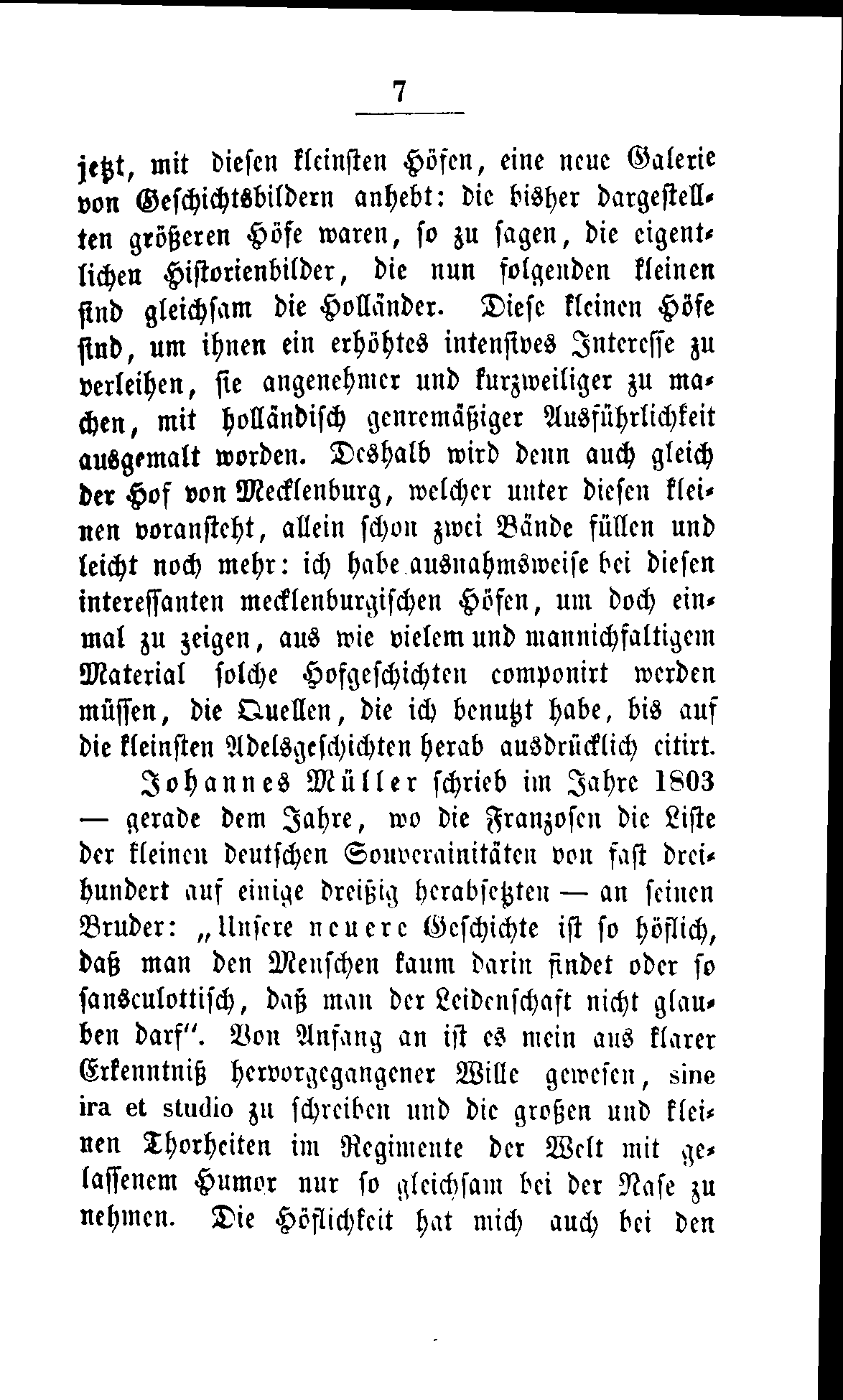 Johannes Müller schrieb im Jahre 1803 — gerade dem Jahre, wo die Franzosen die Liste der kleinen deutschen Souverainitäten von fast dreihundert auf einige dreißig herabsetzten — an seinen Bruder: „Unsere neuere Geschichte ist so höflich, daß man den Menschen kaum darin findet oder so sansculottisch, daß man der Leidenschaft nicht glauben darf". Von Anfang an ist es mein aus klarer Erkenntniß hervorgegangener Wille gewesen, sine ira et studio zu schreiben und die großen und kleinen Thorheiten im Regimente der Welt mit gelassenem Humor nur so gleichsam bei der Nase zu nehmen. Die Höflichkeit hat mich auch bei den