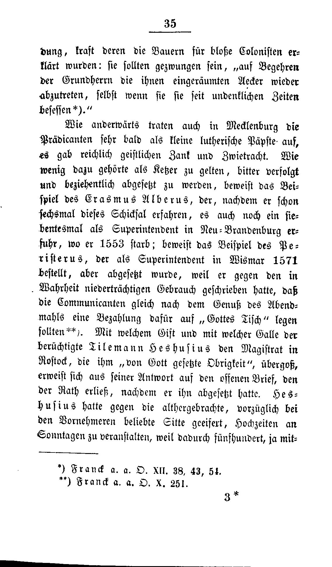 Wie anderwärts traten auch in Mecklenburg die Prädicanten sehr bald als kleine lutherische Päpste auf, es gab reichlich geistlichen Zank und Zwietracht. Wie wenig dazu gehörte als Ketzer zu gelten, bitter verfolgt und beziehentlich abgesetzt zu werden, beweist das Beispiel des Erasmus Alberus, der, nachdem er schon sechsmal dieses Schicksal erfahren, es auch noch ein siebentesmal als Superintendent in Neu-Brandenburg erfuhr, wo er 1553 starb; beweist das Beispiel des Peristerus, der als Superintendent in Wismar 1571 bestellt, aber abgesetzt wurde, weil er gegen den in Wahrheit niederträchtigen Gebrauch geschrieben hatte, daß die Communicanten gleich nach dem Genuß des Abendmahls eine Bezahlung dafür auf „Gottes Tisch" legen sollten[2]. Mit welchem Gift und mit welcher Galle der berüchtigte Tilemann Heshusius den Magistrat in Rostock, die ihm „von Gott gesetzte Obrigkeit", übergoß, erweist sich aus seiner Antwort auf den offenen Brief, den der Rath erließ, nachdem er ihn abgesetzt hatte. Heshusius hatte gegen die althergebrachte, vorzüglich bei den Vornehmeren beliebte Sitte geeifert, Hochzeiten an Sonntagen zu veranstalten, weil dadurch fünfhundert, ja mit-