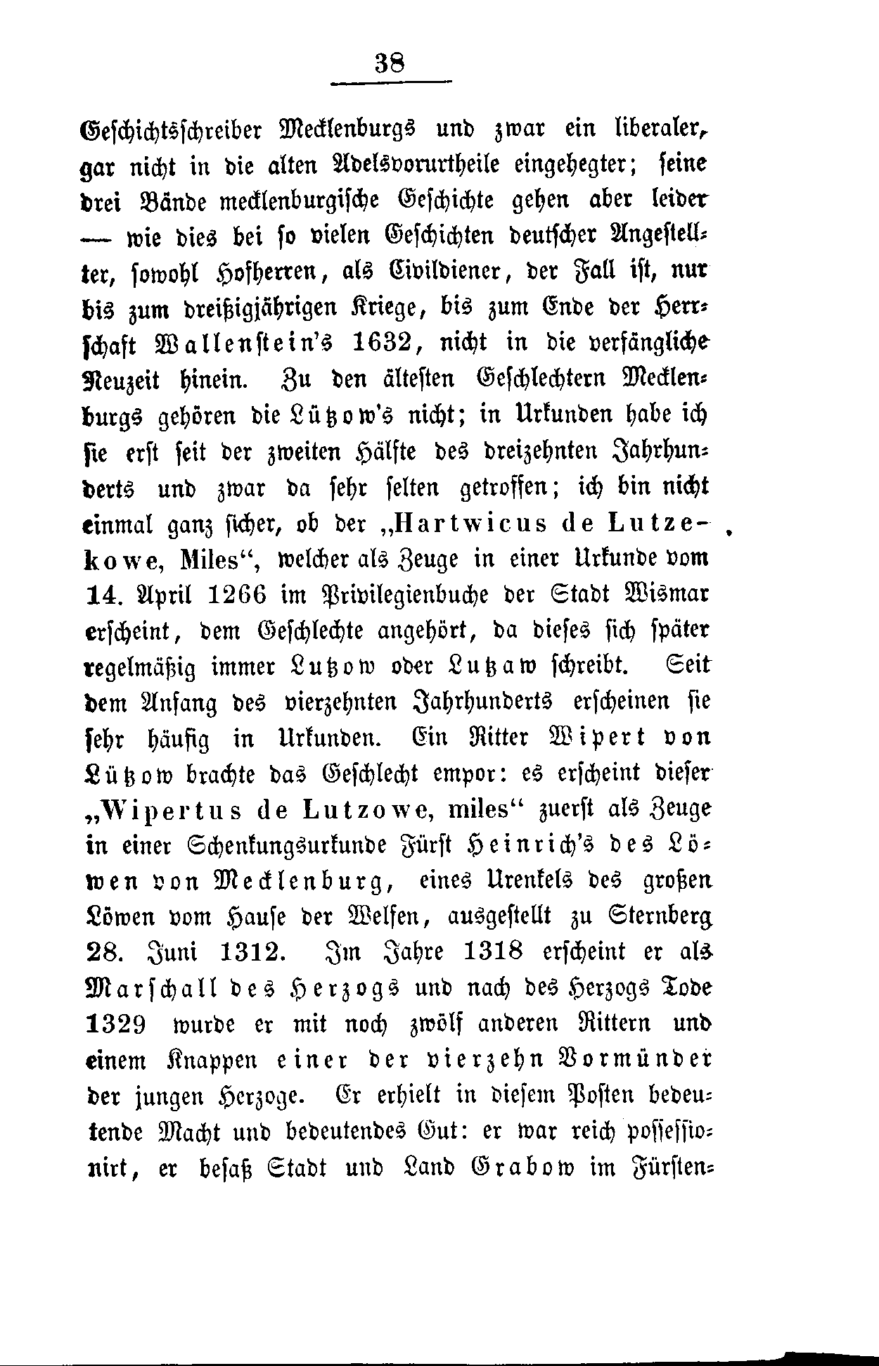Geschichtsschreiber Mecklenburgs und zwar ein liberaler gar nicht in die alten Adelsvorurtheile eingehegter; seine drei Bände mecklenburgische Geschichte gehen aber leider — wie dies bei so vielen Geschichten deutscher Angestellter, sowohl Hofherren, als Civildiener, der Fall ist, nur bis zum dreißigjährigen Kriege, bis zum Ende der Herrschaft Wallenstein's 1632, nicht in die verfängliche Neuzeit hinein. Zu den ältesten Geschlechtern Mecklenburgs gehören die Lützow's nicht; in Urkunden habe ich sie erst seit der zweiten Hälfte des dreizehnten Jahrhunderts und zwar da sehr selten getroffen: ich bin nicht einmal ganz sicher, ob der „Hartwicus de Lutzekowe, Miles", welcher als Zeuge in einer Urkunde vom 14. April 1266 im Privilegienbuche der Stadt Wismar erscheint, dem Geschlechte angehört, da dieses sich später regelmäßig immer Lutzow oder Lutzaw schreibt. Seit dem Anfang des vierzehnten Jahrhunderts erscheinen sie sehr häufig in Urkunden. Ein Ritter Wipert von Lützow brachte das Geschlecht empor: es erscheint dieser „Wipertus de Lutzowe, miles“ zuerst als Zeuge in einer Schenkungsurkunde Fürst Heinrich's des Löwen von Mecklenburg, eines Urenkels des großen Löwen vom Hause der Welfen, ausgestellt zu Sternberg 28. Juni 1312. Im Jahre 1318 erscheint er als Marschall des Herzogs und nach des Herzogs Tode 1329 wurde er mit noch zwölf anderen Rittern und einem Knappen einer der vierzehn Vormünder der jungen Herzoge. Er erhielt in diesem Posten bedeutende Macht und bedeutendes Gut: er war reich possessionirt, er besaß Stadt und Land Grabow im Fürsten-