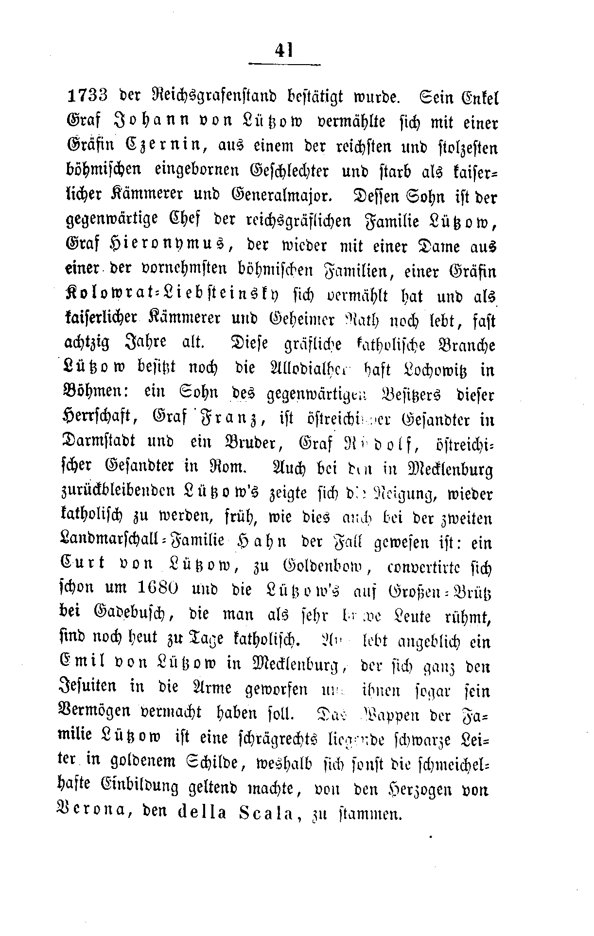 1733 der Reichsgrafenstand bestätigt wurde. Sein Enkel Graf Johann von Lützow vermählte sich mit einer Gräfin Czernin, aus einem der reichsten und stolzesten böhmischen eingebornen Geschlechter und starb als kaiserlicher Kämmerer und Generalmajor. Dessen Sohn ist der gegenwärtige Chef der reichsgräflichen Familie Lützow, Graf Hieronymus, der wieder mit einer Dame aus einer der vornehmsten böhmischen Familien, einer Gräfin Kolowrat-Liebsteinsky sich vermählt hat und als kaiserlicher Kämmerer und Geheimer Rath noch lebt, fast achtzig Jahre alt. Diese gräfliche katholische Branche Lützow besitzt noch die Allodialherrschaft Lochowitz in Böhmen: ein Sohn des gegenwärtigen Besitzers dieser Herrschaft, Graf Franz, ist östreichischer Gesandter in Darmstadt und ein Bruder, Graf Rudolf, östreichischer Gesandter in Rom. Auch bei den in Mecklenburg zurückbleibenden Lützow's zeigte sich die Neigung, wieder katholisch zu werden, früh, wie dies auch bei der zweiten Landmarschall-Familie Hahn der Fall gewesen ist: ein Curt von Lützow, zu Goldenbow, convertirte sich schon um 1680 und die Lützow's auf Großen-Brütz bei Gadebusch, die man als sehr brave Leute rühmt, sind noch heut zu Tage katholisch. Auch lebt angeblich ein Emil von Lützowin Mecklenburg, der sich ganz den Jesuiten in die Arme geworfen und ihnen sogar sein Vermögen vermacht haben soll. Das Wappen der Familie Lützow ist eine schrägrechts liegende schwarze Leiter in goldenem Schilde, weshalb sich sonst die schmeichelhafte Einbildung geltend machte, von den Herzogen von Verona, den della Scala zu stammen.