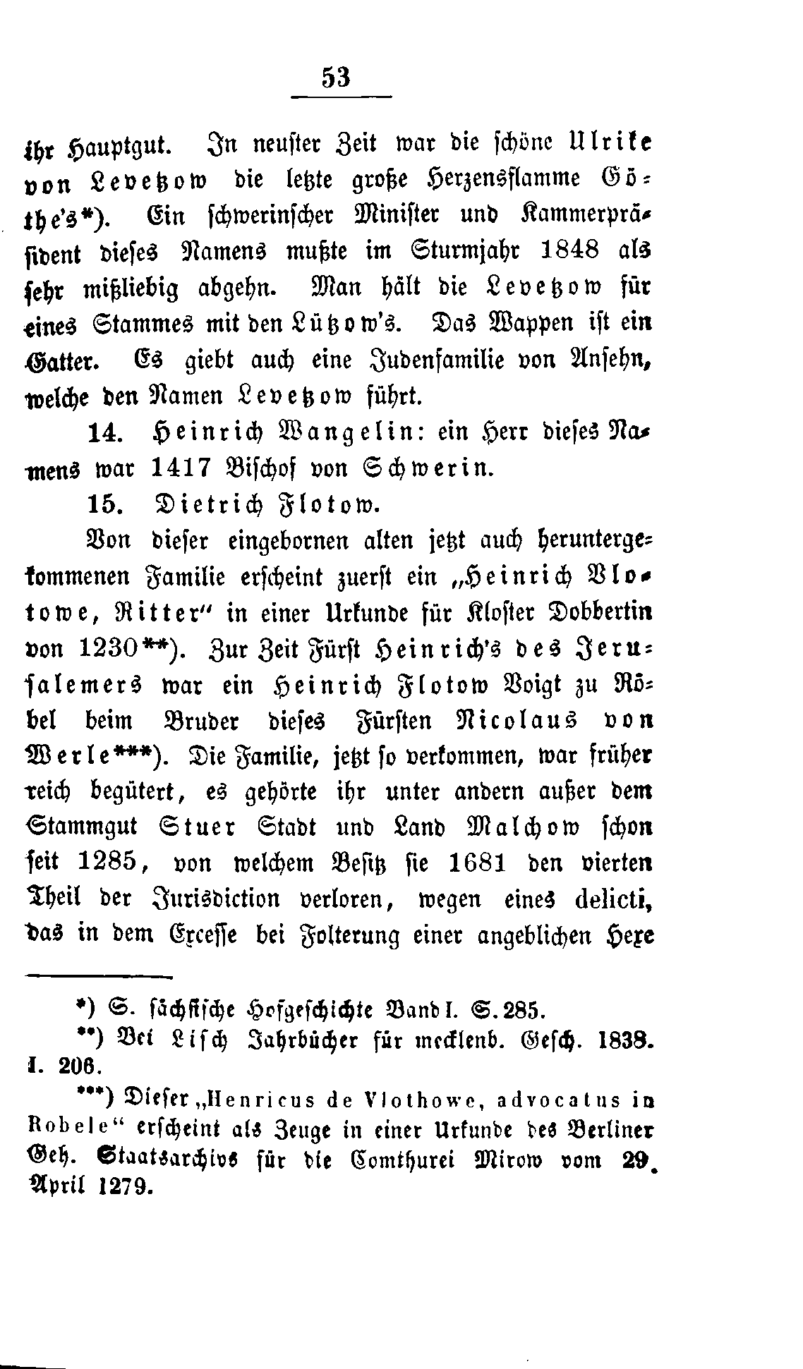 - ihr Hauptgut. In neuster Zeit war die schöne Ulrike von Levetzow die letzte große Herzensflamme Göthe's[1]. Ein schwerinscher Minister und Kammerpräsident dieses Namens mußte im Sturmjahr 1848 als sehr mißliebig abgehn. Man hält die Levetzow für eines Stammes mit den Lützow's. Das Wappen ist ein Gatter. Es giebt auch eine Judenfamilie von Ansehn, welche den Namen Levetzow führt.