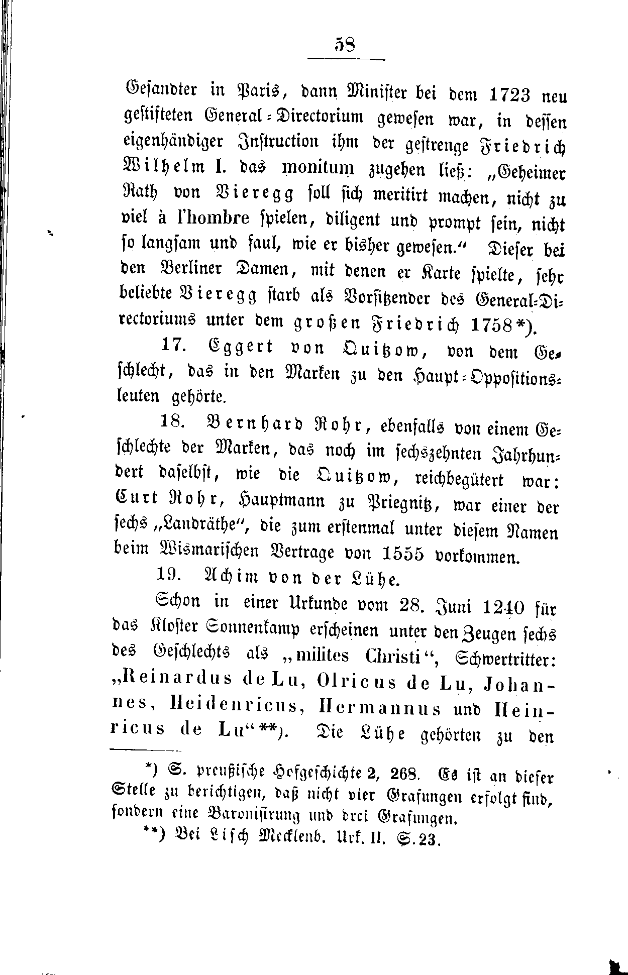 Gesandter in Paris, dann Minister bei dem 1723 neu gestifteten General-Directorium gewesen war, in dessen eigenhändiger Instruction ihm der gestrenge Friedrich Wilhelm I. das monitum zugehen ließ: „Geheimer Rath von Vieregg soll sich meritirt machen, nicht zu viel à l’hombre spielen, diligent und prompt sein, nicht so langsam und faul, wie er bisher gewesen.“ Dieser bei den Berliner Damen, mit denen er Karte spielte, sehr beliebte Vieregg starb als Vorsitzender des General-Directoriums unter dem großen Friedrich 1758[1].