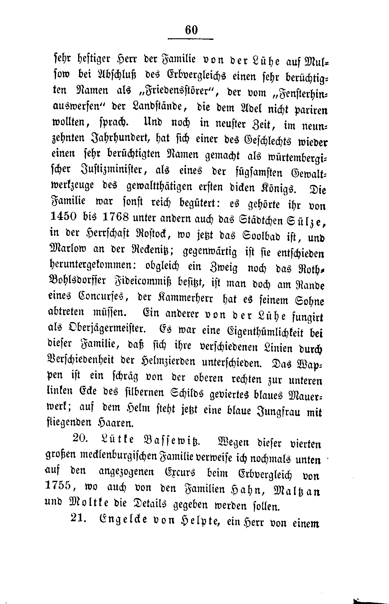 - 20. Lütke Bassewitz. Wegen dieser vierten großen mecklenburgischen Familie verweise ich nochmals unten auf den angezogenen Excurs beim Erbvergleich von 1755, wo auch von den Familien Hahn, Maltzan und Moltke die Details gegeben werden sollen.