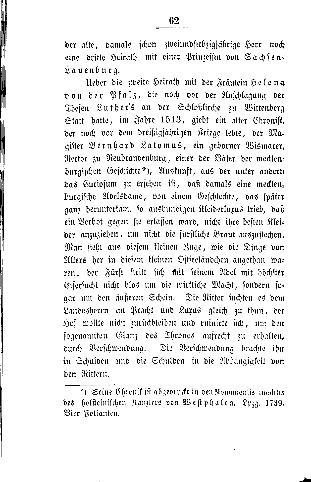 Ueber die zweite Heirath mit der Fräulein Helena von der Pfalz, die noch vor der Anschlagung der Thesen Luthers an der Schloßkirche zu Wittenberg Statt hatte, im Jahre 1513, giebt ein alter Chronist, der noch vor dem dreißigjährigen Kriege lebte, der Magister Bernhard Latomus, ein geborner Wismarer, Rector zu Neubrandenburg, einer der Väter der mecklenburgischen Geschichte[1], Auskunft, aus der unter andern das Curiosum zu ersehen ist, daß damals eine mecklenburgische Adelsdame, von einem Geschlechte, das später ganz herunterkam, so ausbündigen Kleiderluxus trieb, daß ein Verbot gegen sie erlassen ward, nicht ihre besten Kleider anzuziehen, um nicht die fürstliche Braut auszustechen. Man sieht aus diesem kleinen Zuge, wie die Dinge von Alters her in diesem kleinen Ostseeländchen angethan waren: der Fürst stritt sich mit seinem Adel mit höchster Eifersucht nicht blos um die wirkliche Macht, sondern sogar um den äußeren Schein. Die Ritter suchten es dem Landesherrn an Pracht und Luxus gleich zu thun, der Hof wollte nicht zurückbleiben und ruinirte sich, um den sogenannten Glanz des Thrones aufrecht zu erhalten, durch Verschwendung. Die Verschwendung brachte ihn in Schulden und die Schulden in die Abhängigkeit von den Rittern.