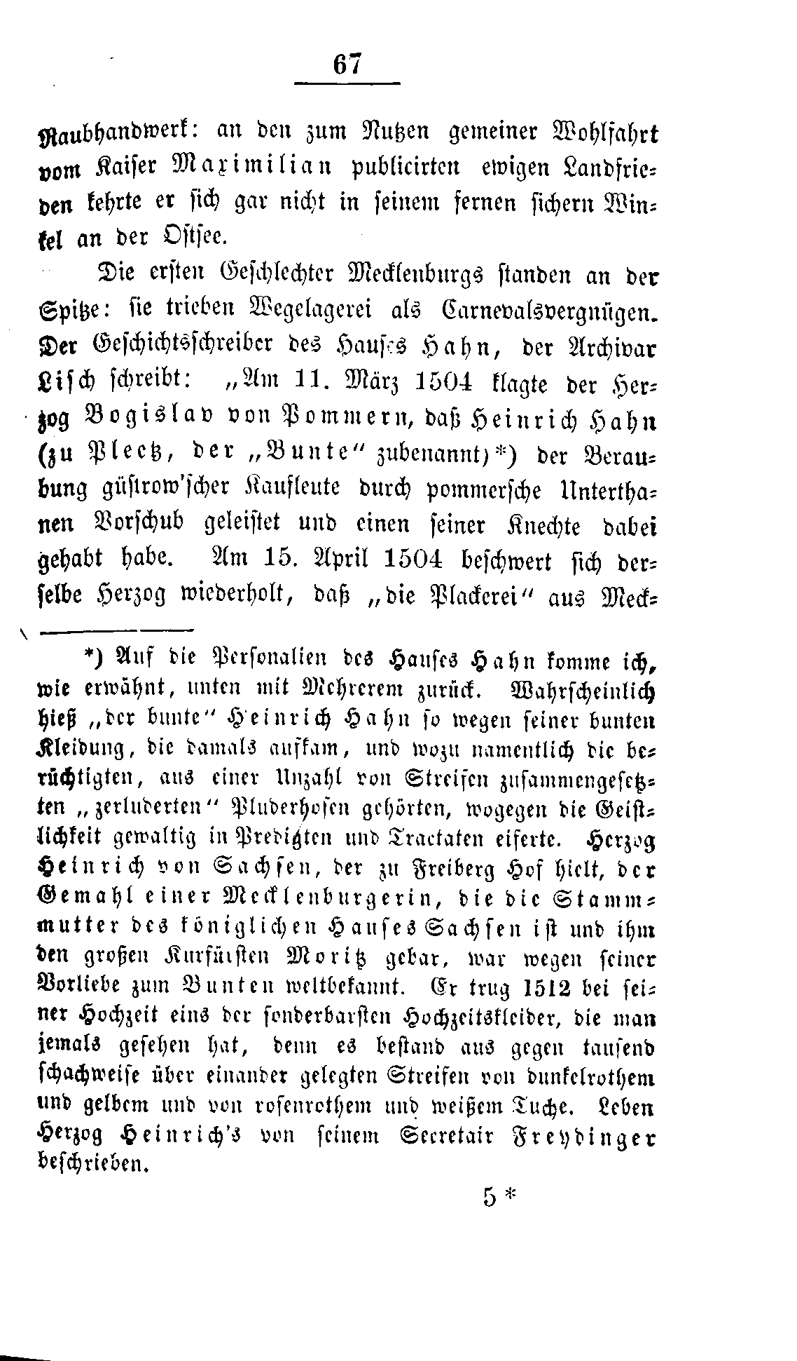 - ↑ Auf die Personalien des Hauses Hahn komme ich, wie erwähnt, unten mit Mehrerem zurück. Wahrscheinlich hieß „der bunte“ Heinrich Hahn so wegen seiner bunten Kleidung, die damals aufkam, und wozu namentlich die berüchtigten, aus einer Unzahl von Streifen zusammengesetzten „zerluderten“ Pluderhosen gehörten, wogegen die Geistlichkeit gewaltig in Predigten und Tractaten eiferte. Herzog Heinrich von Sachsen, der zu Freiberg Hof hielt, der Gemahl einer Mecklenburgerin, die die Stammmutter des königlichen Hauses Sachsen ist und ihm den großen Kurfürsten Moritz gebar, war wegen seiner Vorliebe zum Bunten weltbekannt. Er trug 1512 bei seiner Hochzeit eins der sonderbarsten Hochzeitskleider, die man jemals gesehen hat, denn es bestand aus gegen tausend schachweise über einander gelegten Streifen von dunkelrothem und gelbem und von rosenrothem und weißem Tuche. Leben Herzog Heinrich’s von seinem Secretair Freydinger beschrieben.