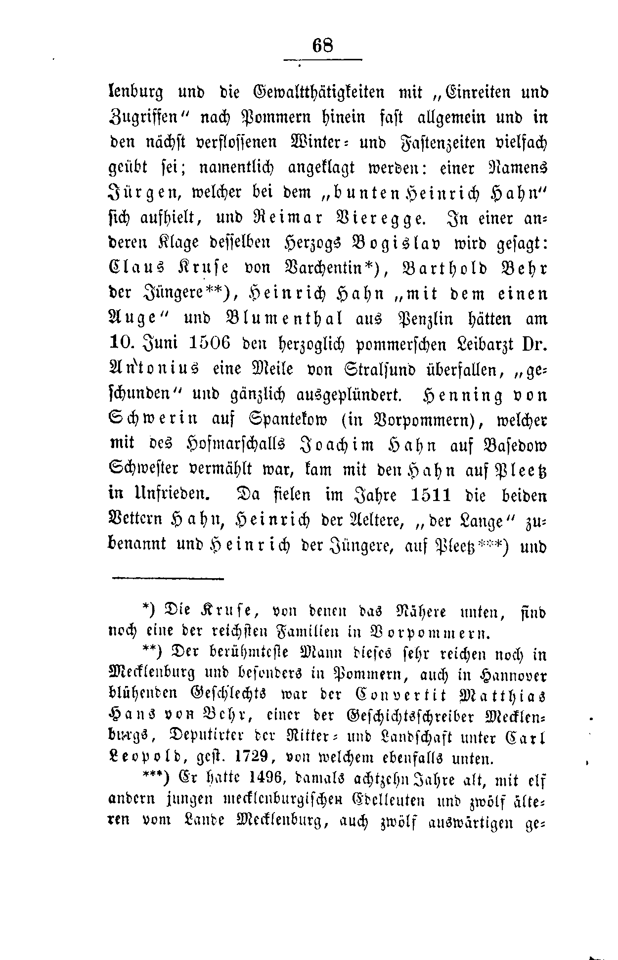 , Heinrich Hahn „mit dem einen Auge" und Blumenthal aus Penzlin hätten am 10. Juni 1506 den herzoglich pommerschen Leibarzt Dr. Antonius eine Meile von Stralsund überfallen, „geschunden" und gänzlich ausgeplündert. Henning von Schwerin auf Spantekow (in Vorpommern), welcher mit des Hofmarschalls Joachim Hahn auf Basedow Schwester vermählt war, kam mit den Hahn auf Pleetz in Unfrieden. Da fielen im Jahre 1511 die beiden Vettern Hahn, Heinrich der Aeltere, „der Lange" zubenannt und Heinrich der Jüngere, auf Pleetz[3] und